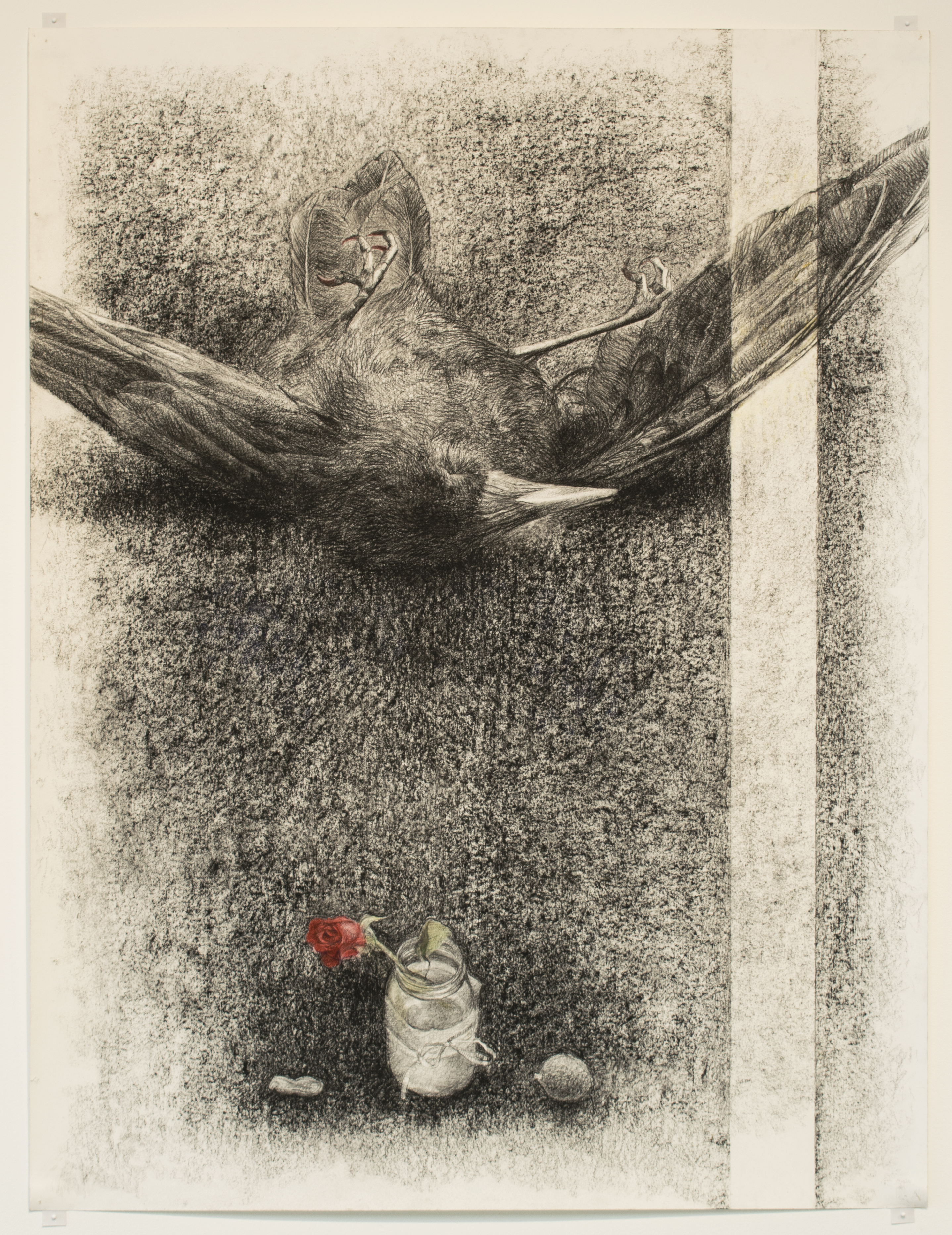Charcoal and pastel drawing of dead bird on its back with a red rose in a jar of water beside it.