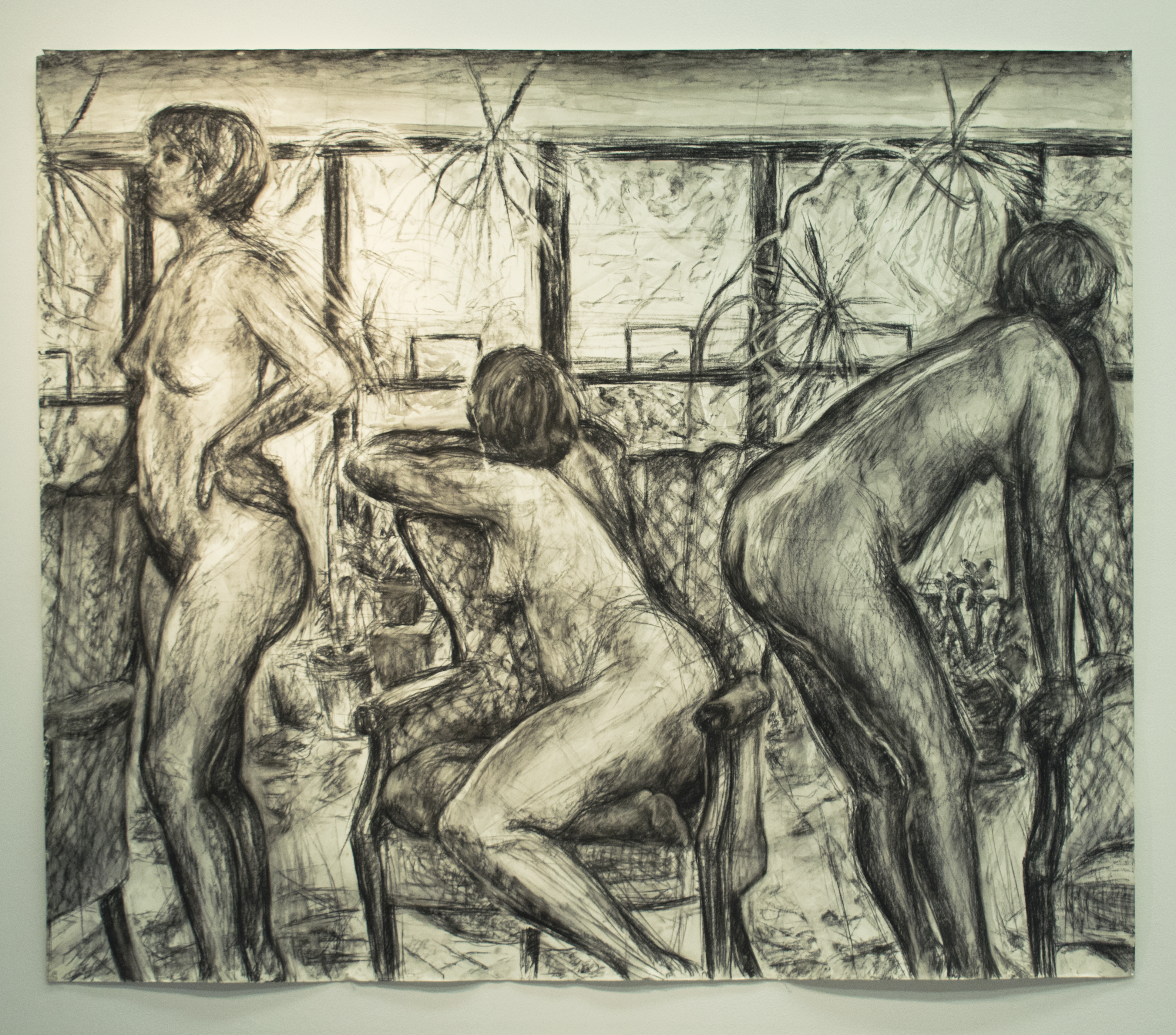 Large charcoal drawing of three female figures in room, one seated on chair in center, window with plants in background