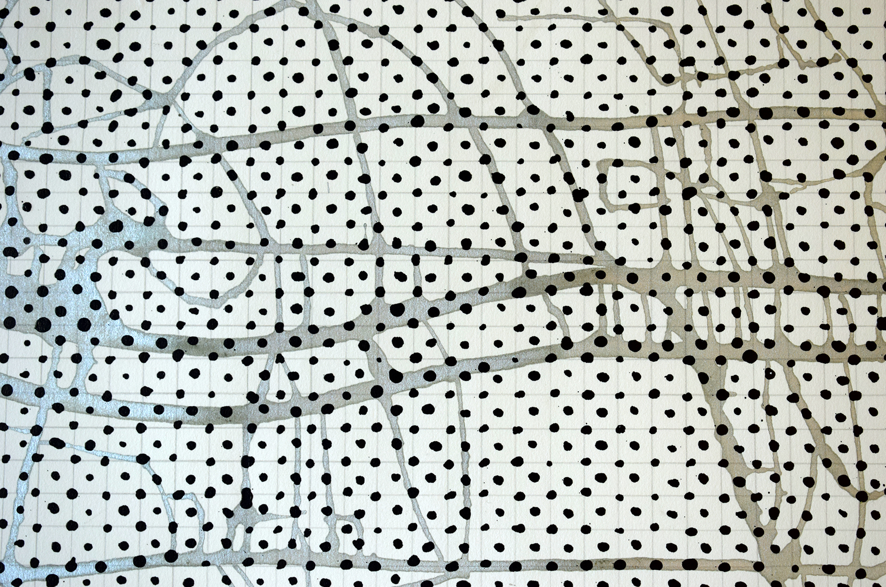 Detail view of larger wall installation. Abstract painting based on a grid, showing black dots on a grid of pencil