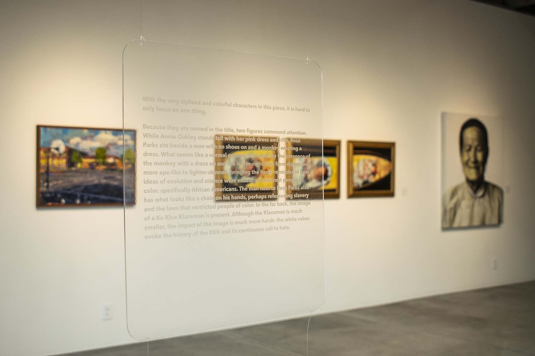 Installation view of gallery with a clear acrylic panel in the foreground and three artworks on the wall in the background. The acrylic panel has text printed on it. The artworks are paintings.