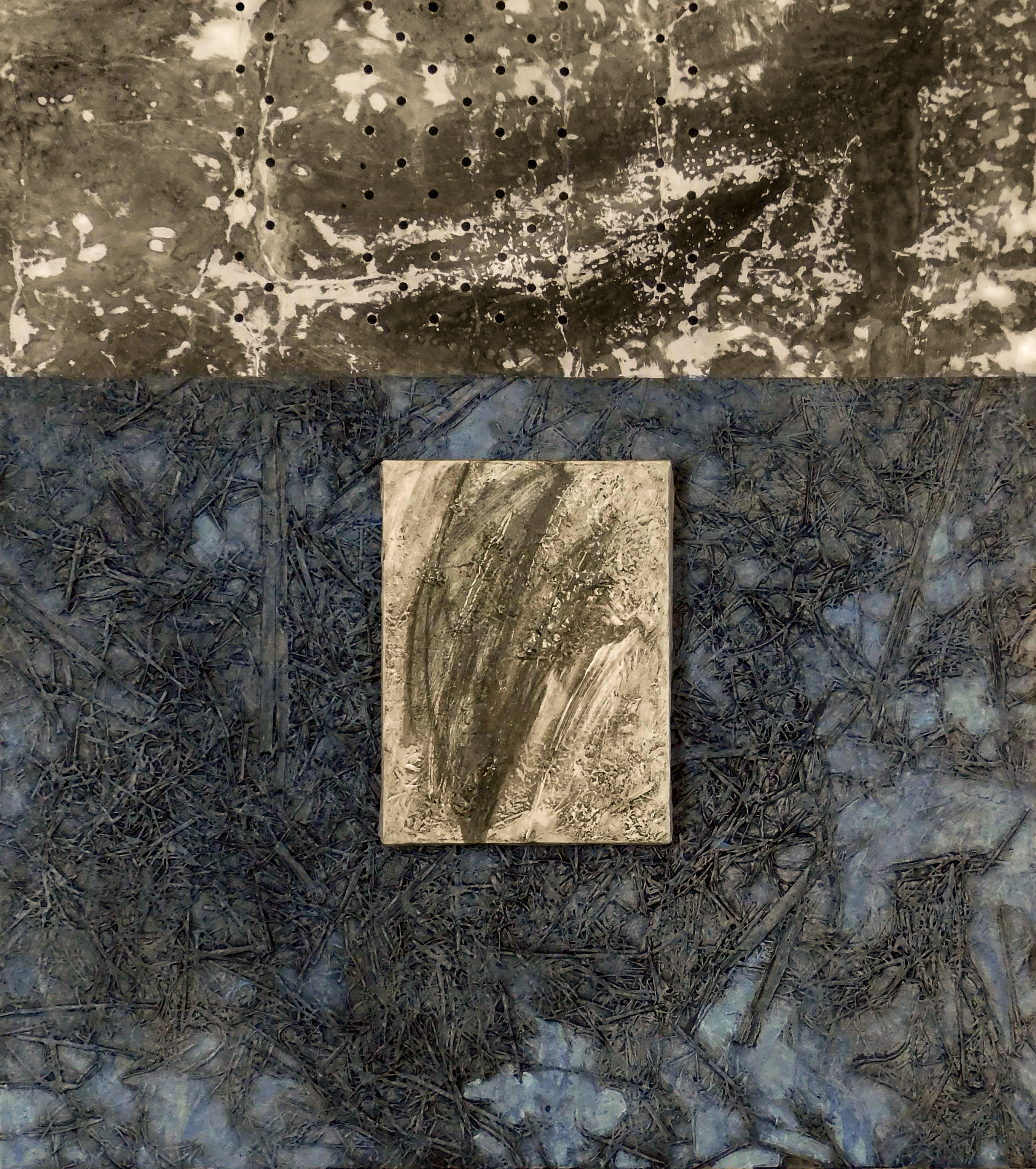 sweep the studio floor and put it into the artwork he was making. It was 15 years before he actually did that, but the essence of the comment was about making artwork that “used the stuff of life” as a medium. This concept has led Thatcher to embed tree branches, bark, leaves, and hay in paint, and to employ parts and processes from a 24-year career as a cabinet maker in his artwork.