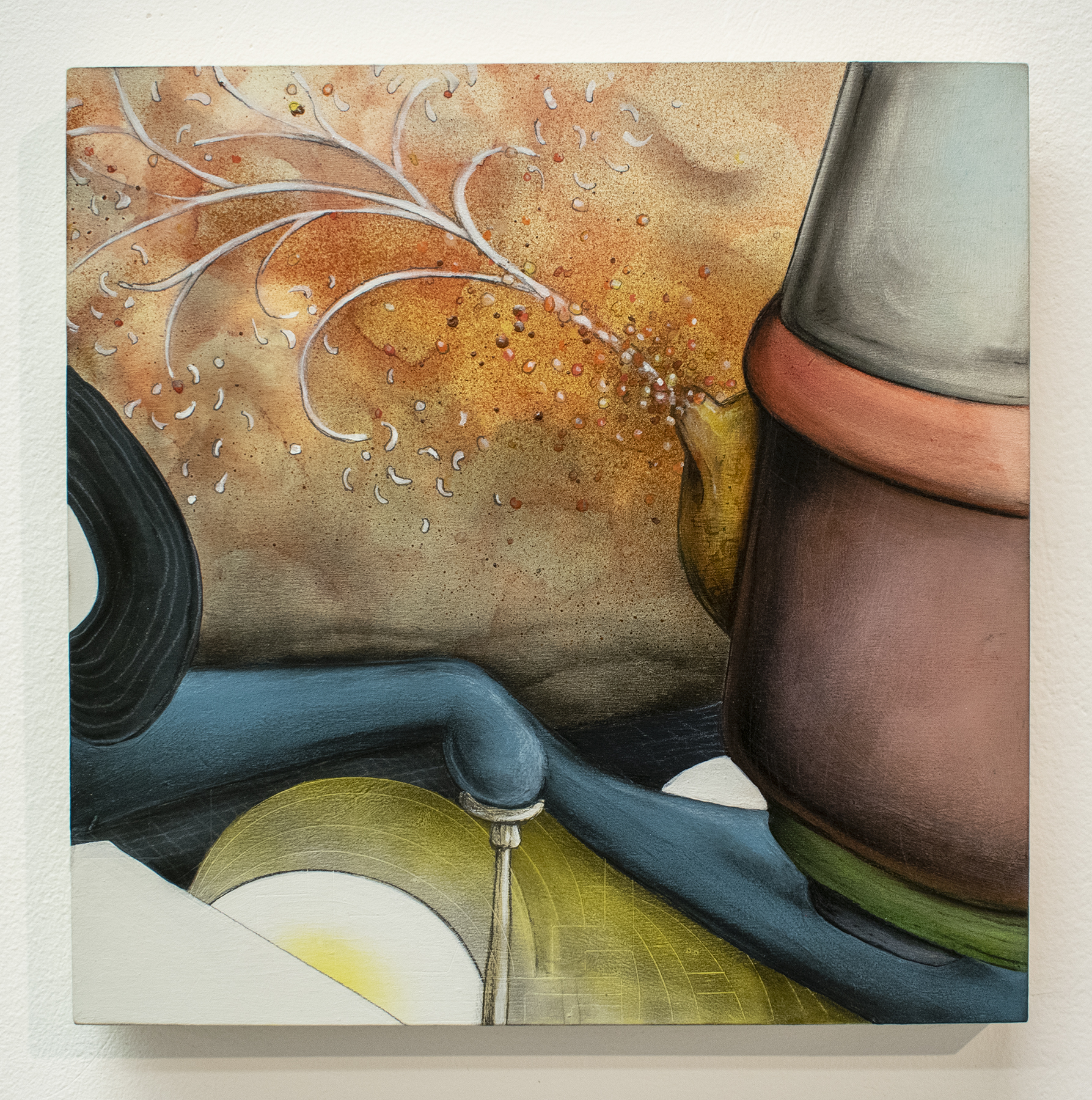 Dowser’s Faith, 2017, steel, wood, paint, belting, rice paper, mirror, 93″ x 83″ x 15″