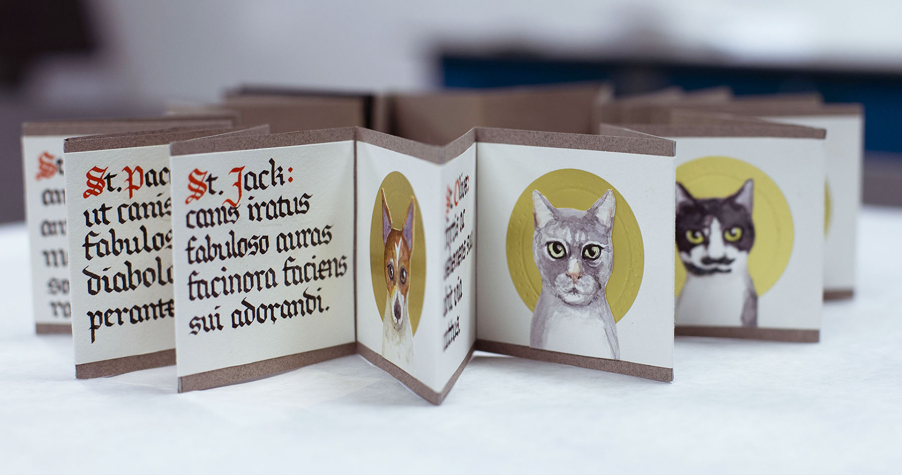 Tatiana Gebert, Pets Meus in Villam, 2019, watercolor, pen, mixed media, 3" x 3" accordion book