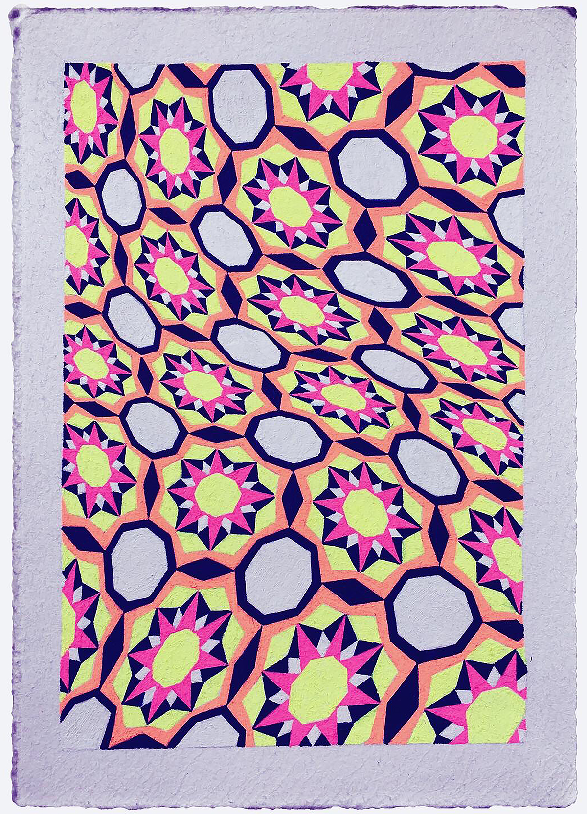 A complex abstract geometric pattern drawn in ink on handmade paper. The pattern shows sun shapes, each with a yellow center, and bright pink triangular rays emanating from them. Each star is surrounded by pinkins gray, dark purple and yellow diamonds and triangles. These are all connected by a salmon orange grid with pinkish grey octagons placed at regular intervals. The pattern is uneven, and undulating.