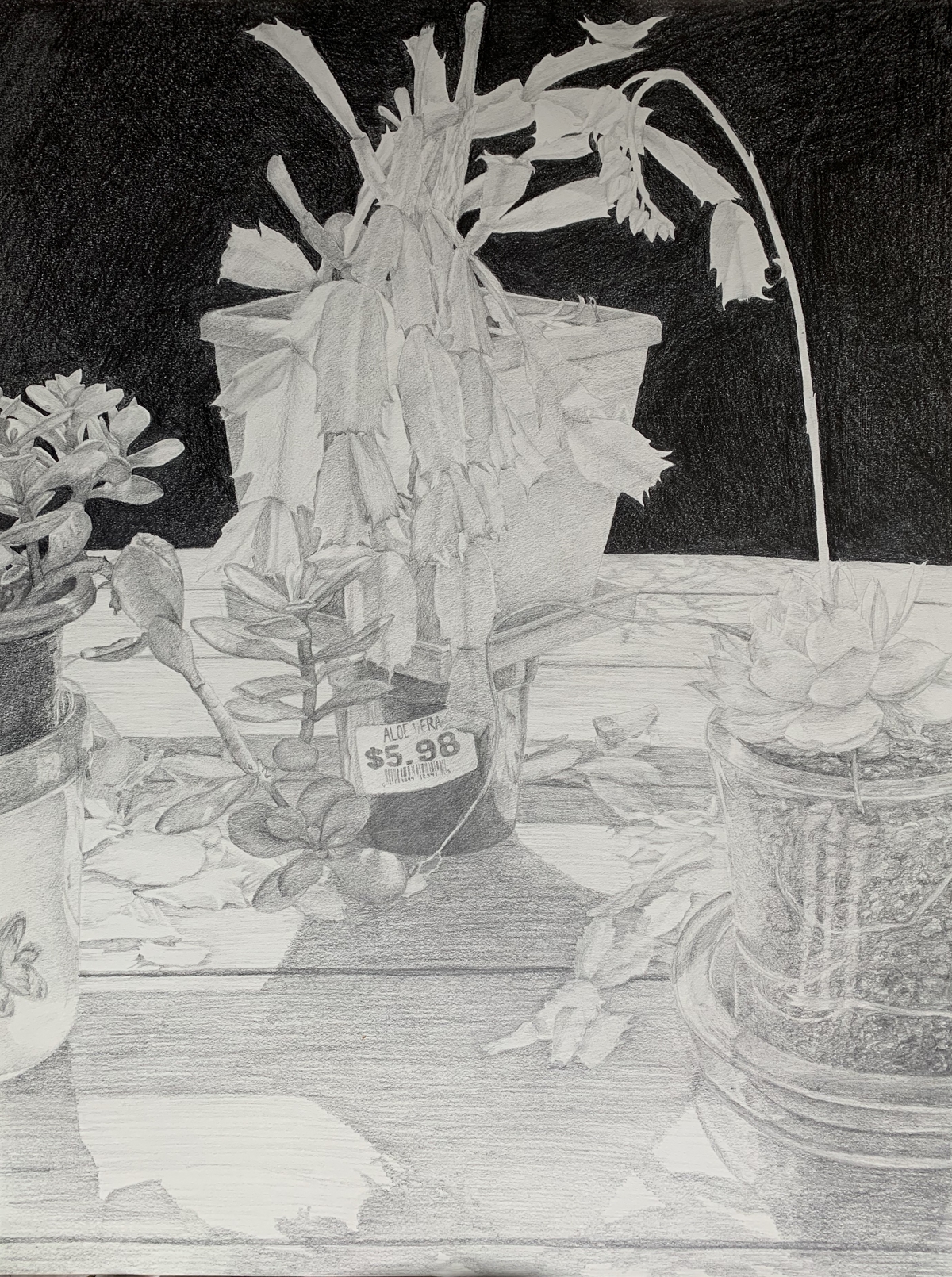 Ellen Cervantes; Bad Plant Mom, 2020; Graphite on Paper; 24 x 18″; Drawing