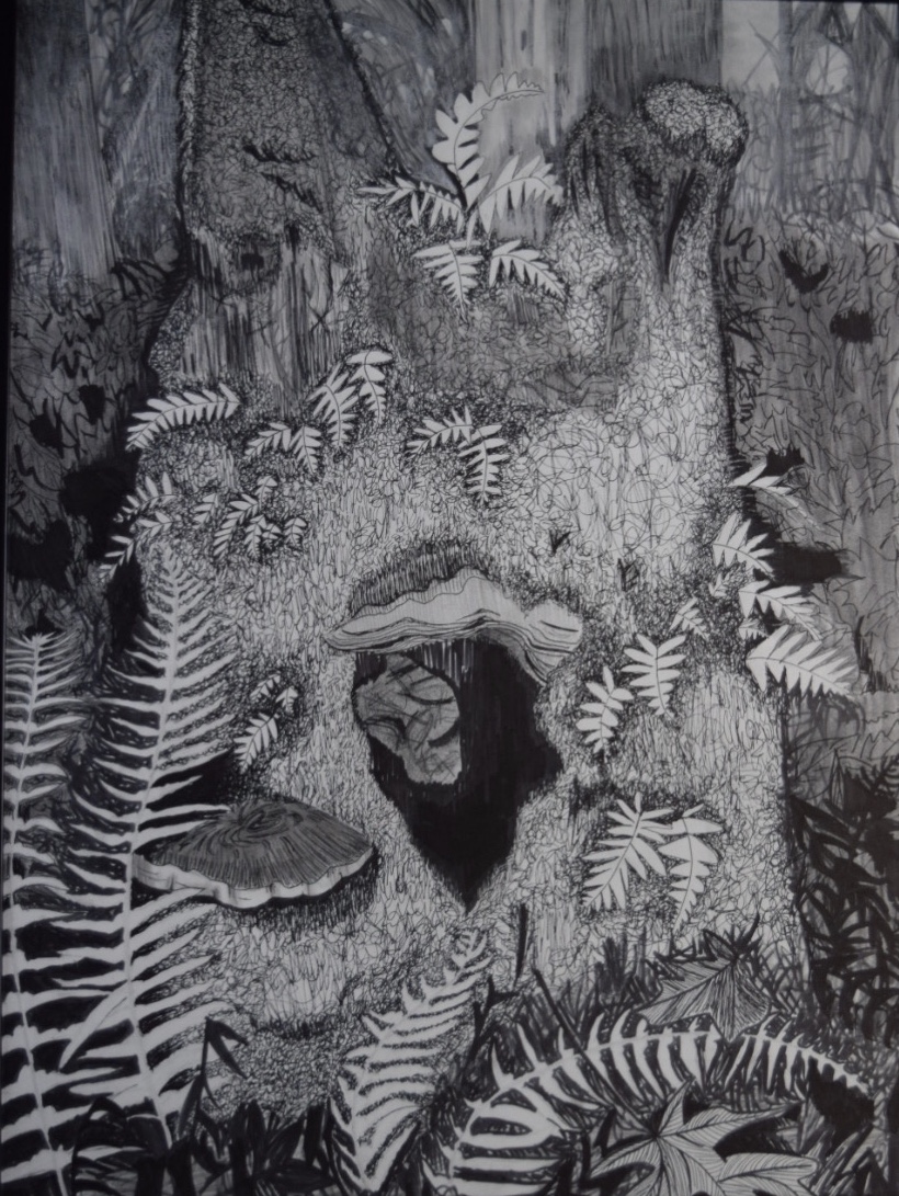 Holly Lawrence; Mossy Stump, 2019; Pen, Pencil, and Chalk on Paper; 24 x 18″; Drawing