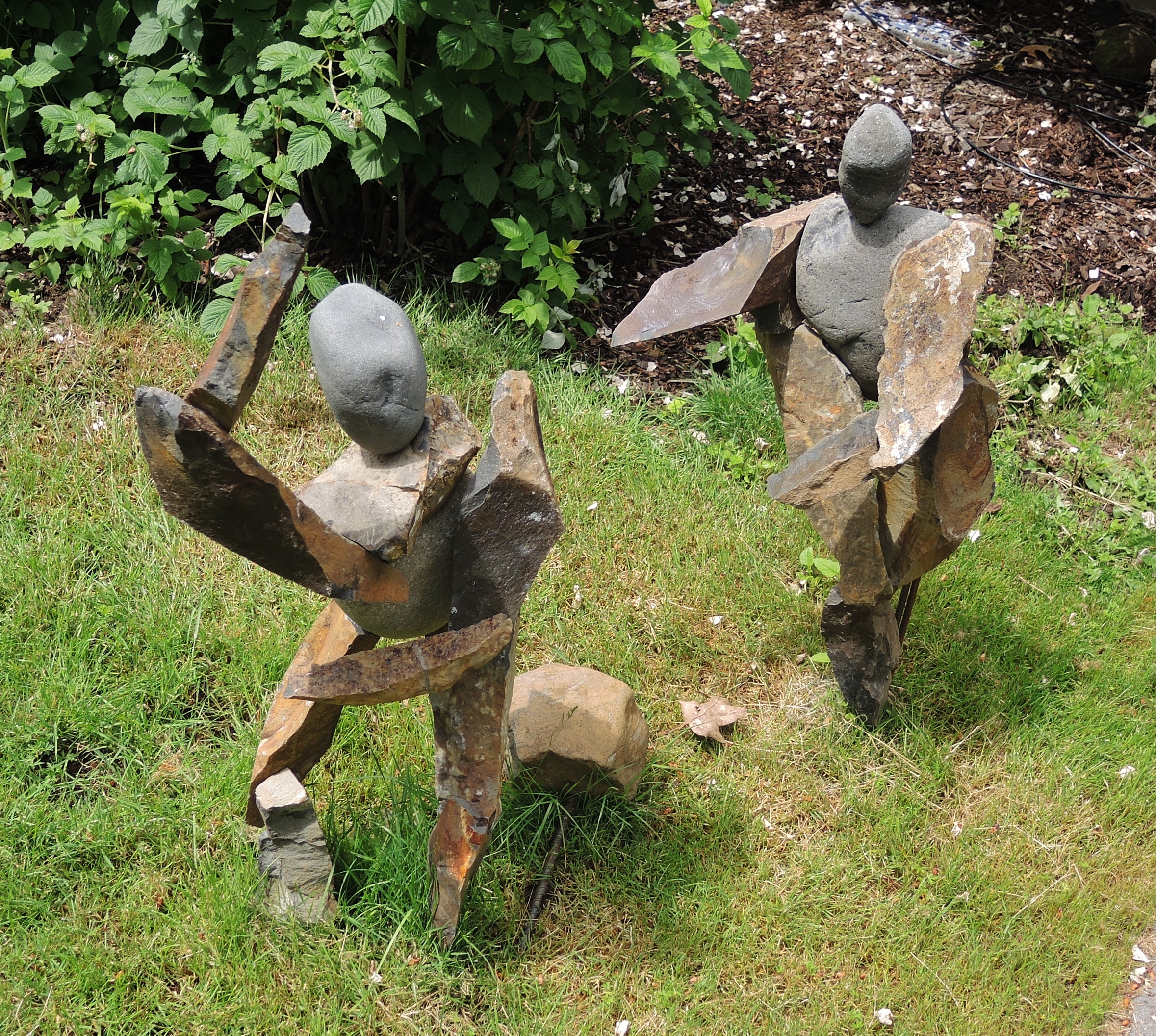 Kevin Lane; Dancers, 2019; Basalt from the Clackamas River Cliffs, River Rock, Steel Pins and Epoxy, Rebar; 36″ Tall; Drawing