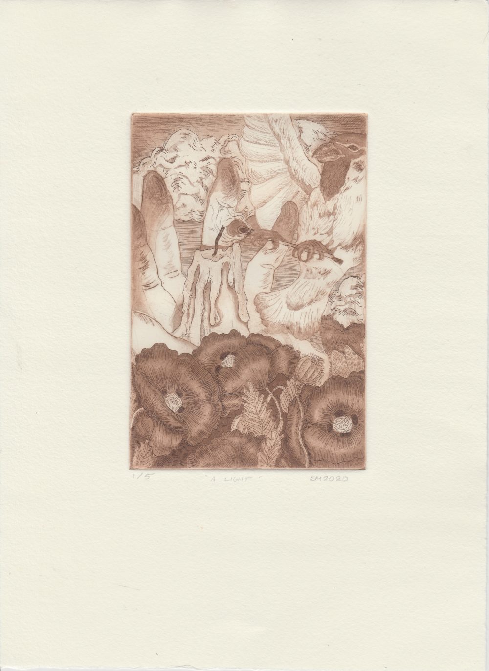 Emerson Mitchell; A Light, 2020; Etching, Aquatint, and Drypoint on Hahnemuhle Copperplate paper; 11 x 8″; Printmaking