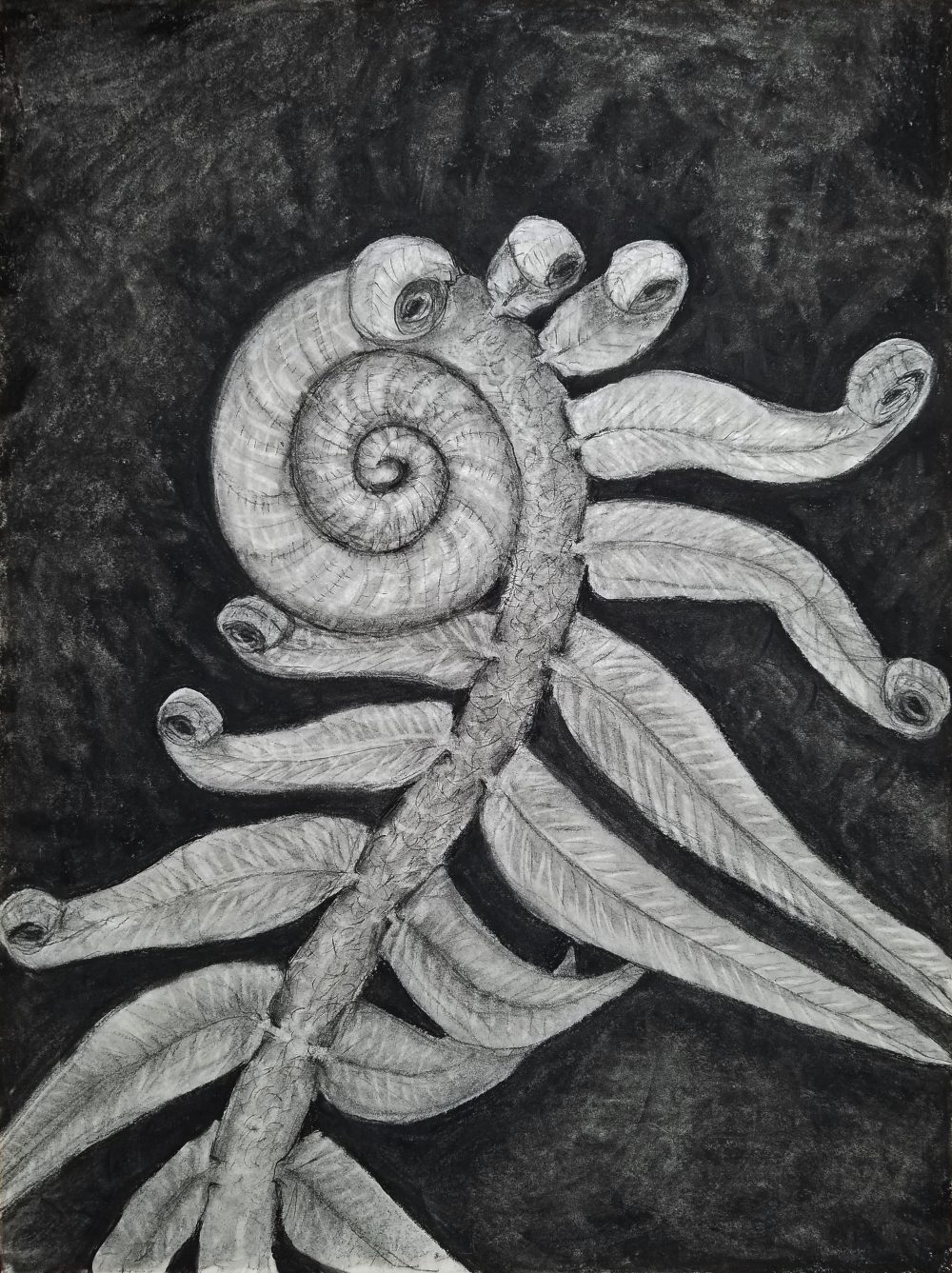 Maggie Dunklee; Fern Frond Unfurling, 2020; Compressed Charcoal and Erasers; 18 x 24″; Drawing