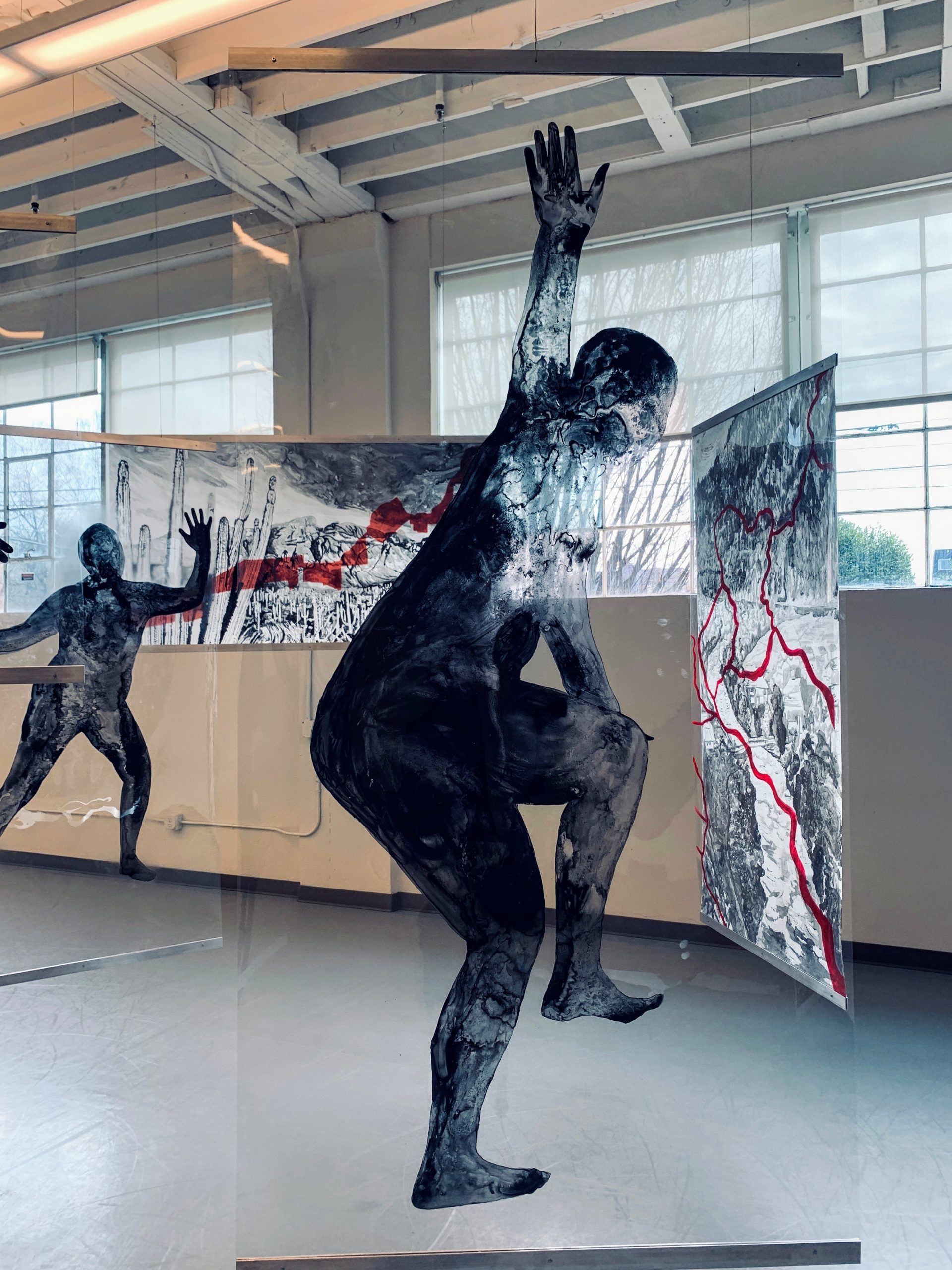 The January-February 2021 studio installation (UN)Belonging at the NW Dance Project includes fifteen suspended life-size ink drawings of silhouetted bodies and maps of contested borderlands on layered sheets of DuraLar. The installation invites viewers to move between drawings depicting the mountains of Kashmir disrupted by lines of control at the Pakistan/India border. Other silhouetted figures navigate the liminal space of the Sonoran Desert; the US/Mexico border cuts through the landscape drawing on the reverse.