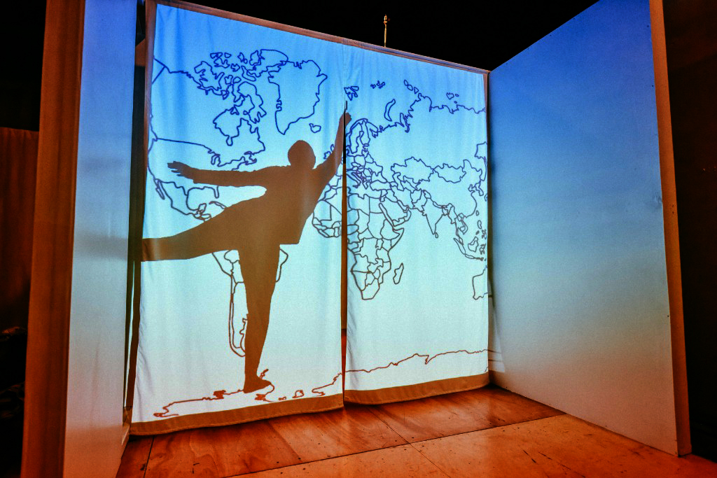 (UN) Belonging, a performance in 2018, explores the cycle of welcoming and excluding, and what it means to belong to a community. What is the urge that makes one push the next newcomer out of the country? Gestures of welcoming and excluding are performed by an animated shadow figure, and a live dancer interacts with the silhouette and the mapped borderlines. I collaborated with three performers of color to choreograph movement in response to the projected shadow figure and borderlines. – Sabina Haque