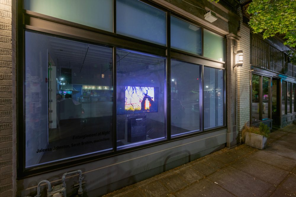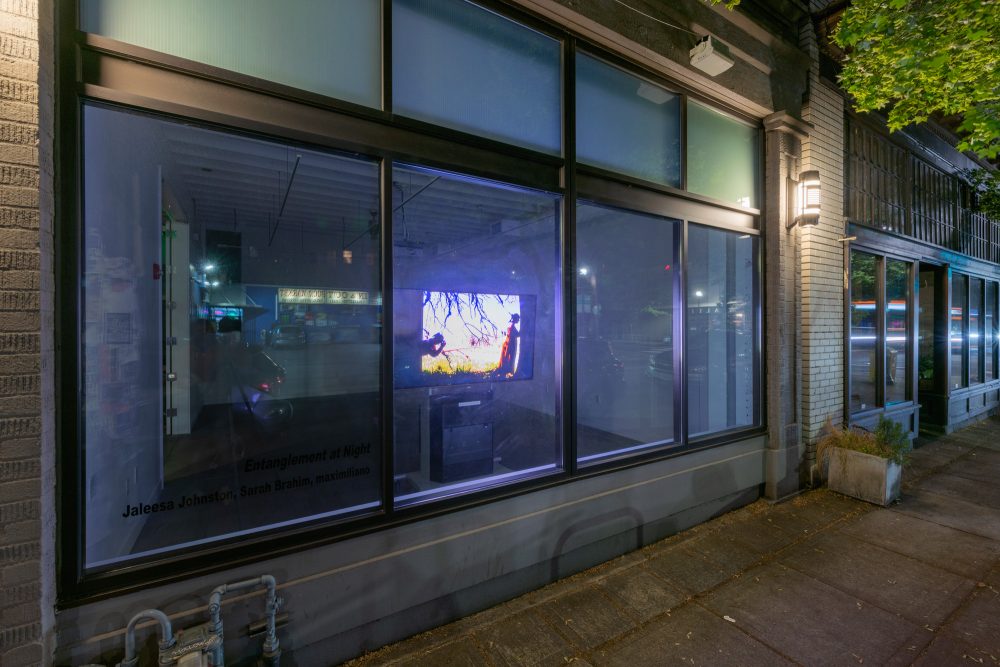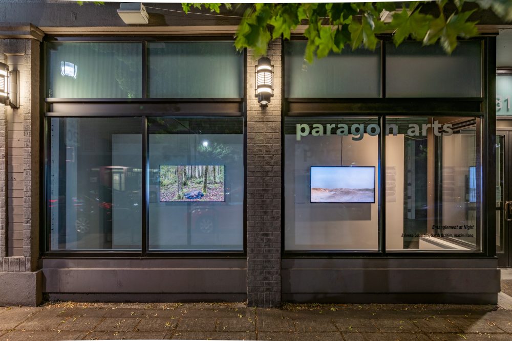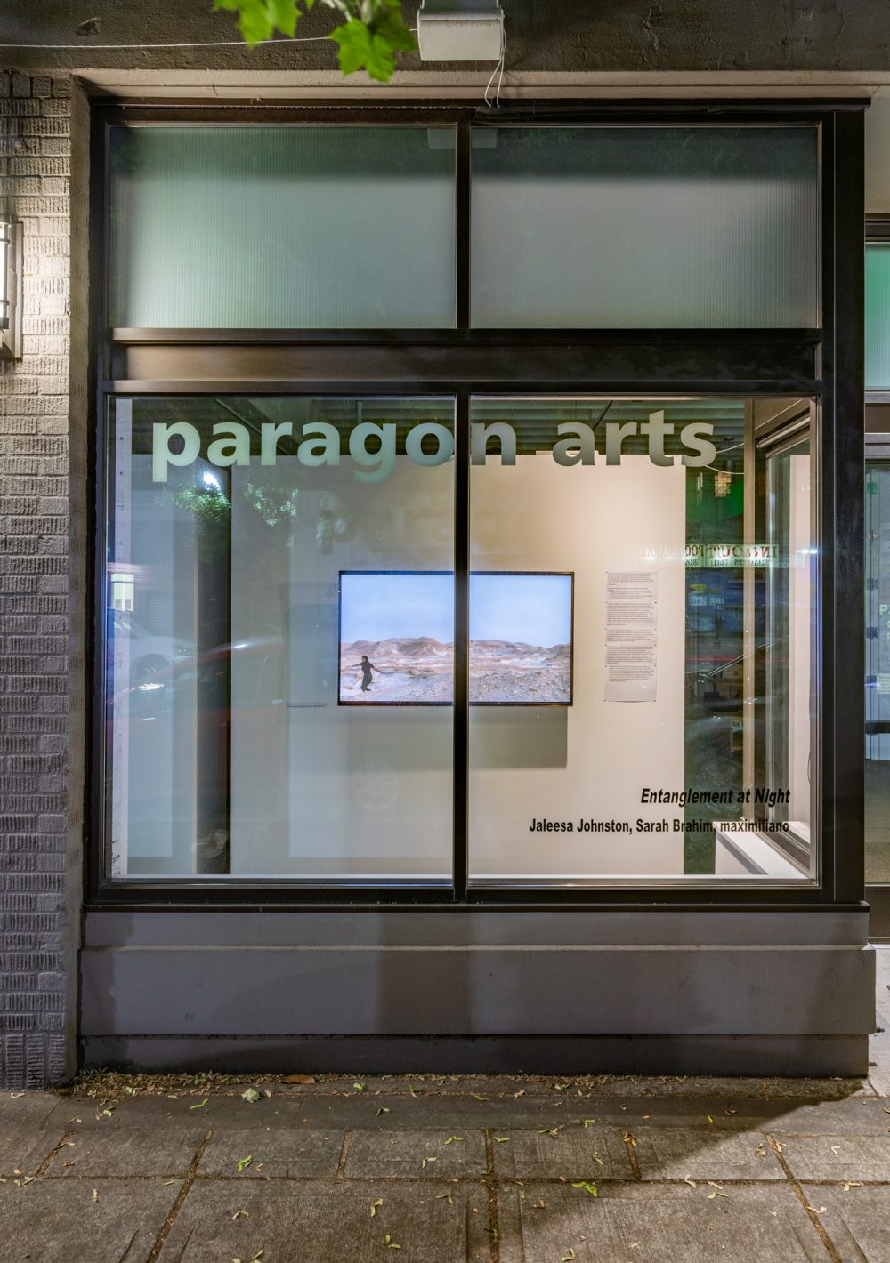 The Paragon Arts Gallery at Portland Community College, Cascade Campus is proud to present Entanglement at Night, a window exclusive nighttime exhibition featuring a collection of video works from artists maximiliano, Jaleesa Johnston and Sarah Brahim working with gestures of embodiment within and through digital and physical landscapes. These works form dialogues between performances within a nature of physical space, through a nature of the body and extension into video space.
