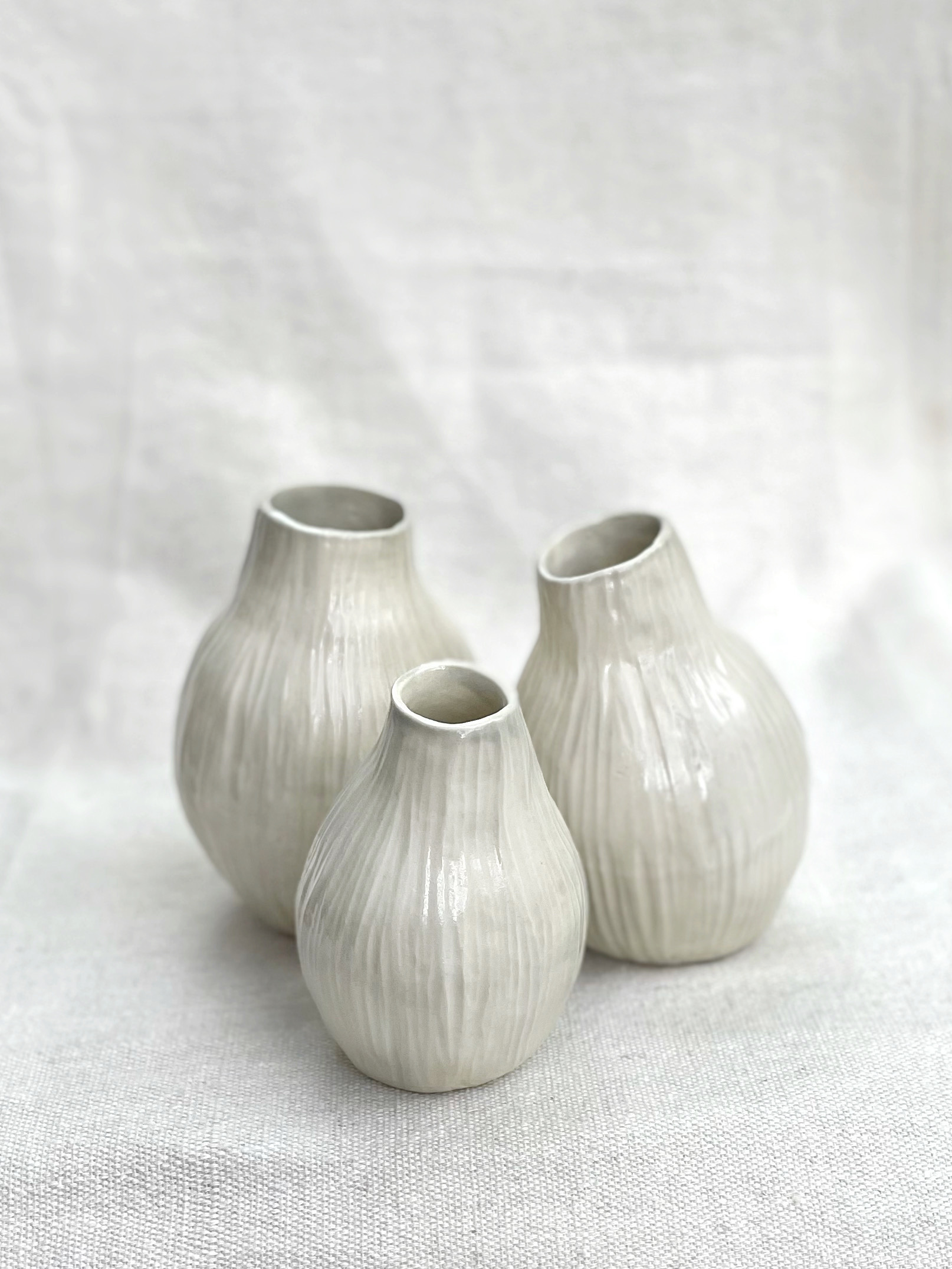 In this class I primarily drew my inspiration from organic plant shapes. I used the closed form technique to make this cluster of three eucalyptus pods. To carve the texture I used a dull pencil and I finished them with a white matte glaze.