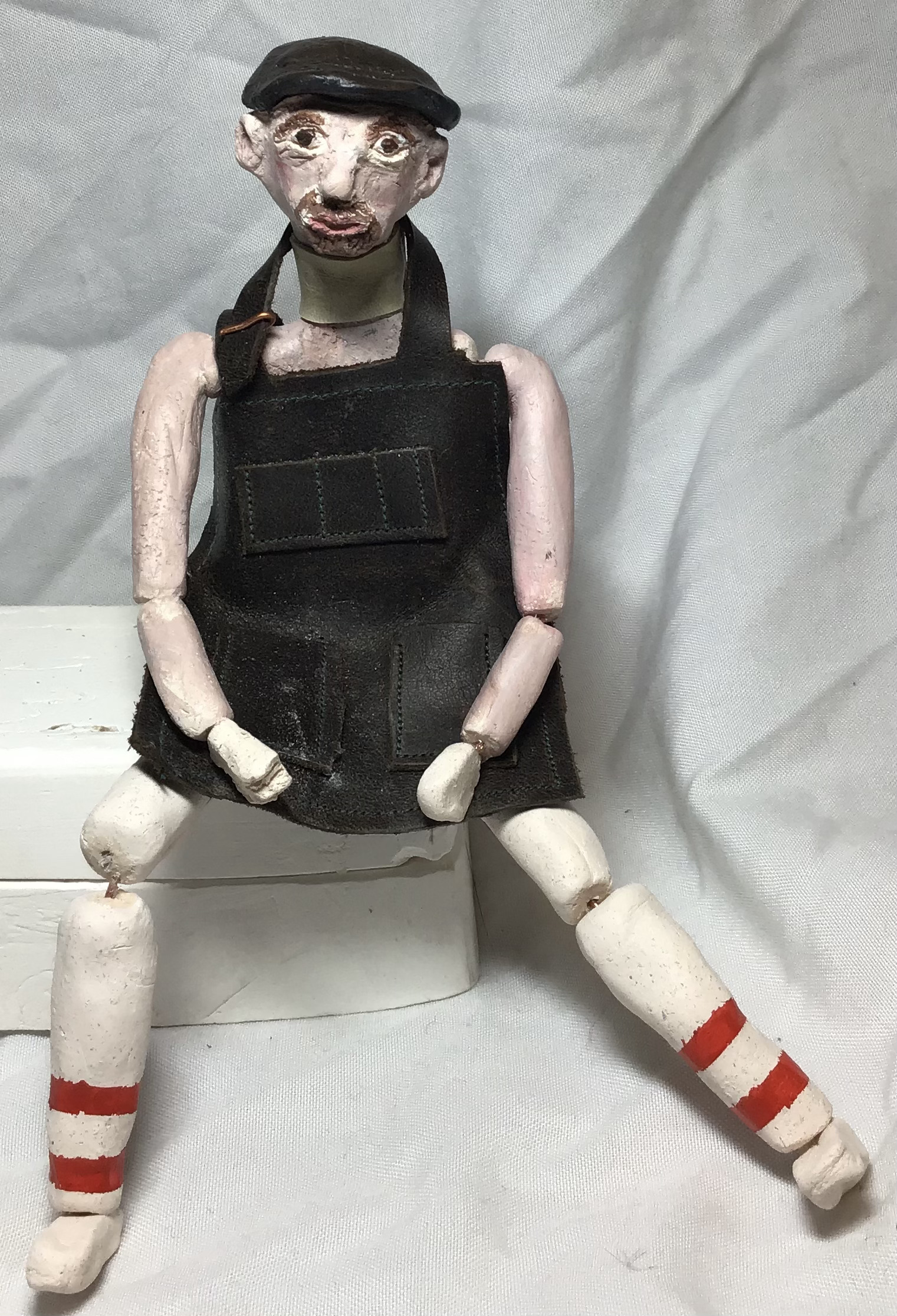 This work was a result of revisiting a partially completed project begun in 2020. The result was partially fired body parts with a vague plan of painting and finding a way to put together at some future time. The future was COVID. After watching all the episodes of “The Repair Shop” on Netflix, I was inspired to put together and paint my character, “Shop master.”