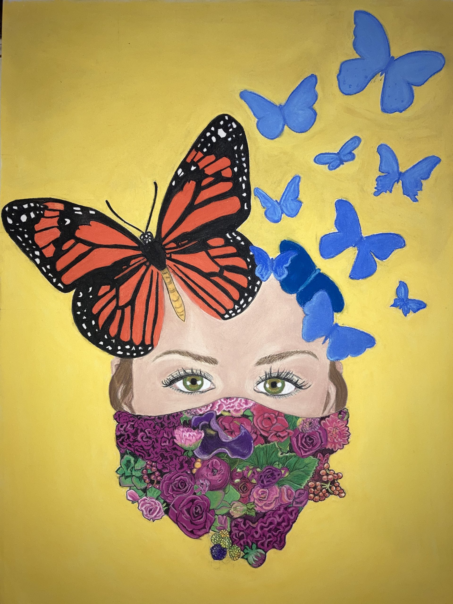 This drawing is a class project where I explored NuPastels. This is a collage where I used my own face in the hopes of depicting what we all were experiencing during the pandemic. I wanted to make something beautiful out of difficult circumstances.