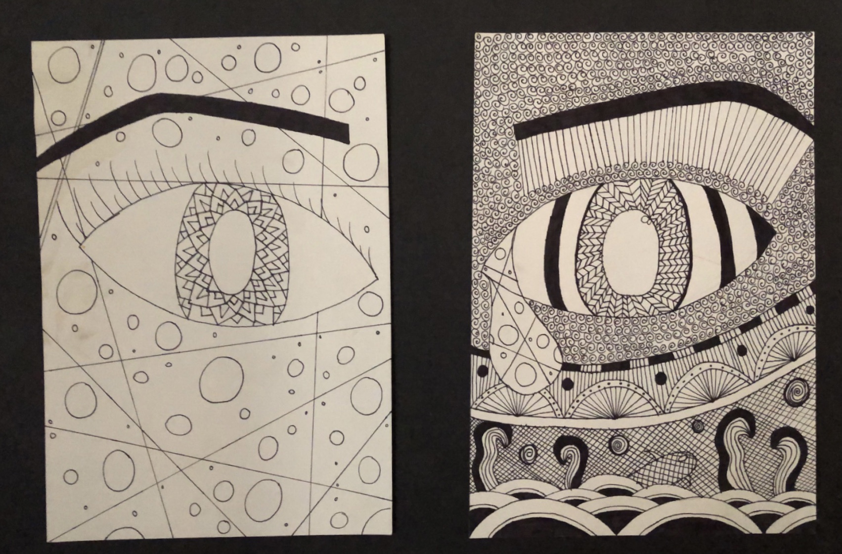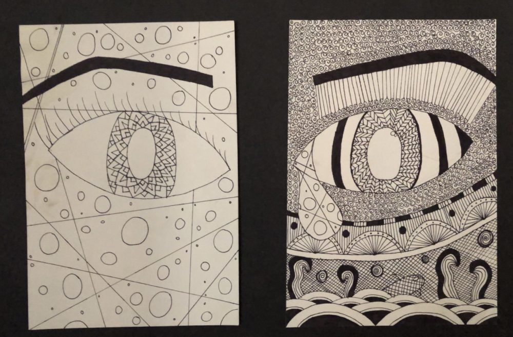 This drawing I made was in class when we were exploring the idea of zentangle and the concept of sketching and how you can also make art with this as well. I named this piece eye in my indigenous dialect "IXTELOLOHTLI". This was my first time formally sktching, I say formally because I was always told this was not art. When sketching this I am thinking about the theme and how people always say "I wish I had there life" or "I wish we could trade lives" but when people say this they usually don't know the person well enough to say that they want their life. I painted myself on the right side and my old friend on the left because she would always say she wished she had my life or that she wished she was like me because she was so "boring" and her home life was boring as well. But what she didn't know was that my real life at home was bad because it was filled with domestic violence and sexual abuse as a young child. At school I was happy because it was the only place I felt safe which is why everyone liked me at school because I was always happy at school. When I was drawing the patterns and the monster on my side I focused on the texture I was giving off to the person seeing the painting. And the tear drop I had painted on my side was because in reality I wanted her life because she had a great life but she saw it as boring which is why I made my tear drop the pattern of her side.