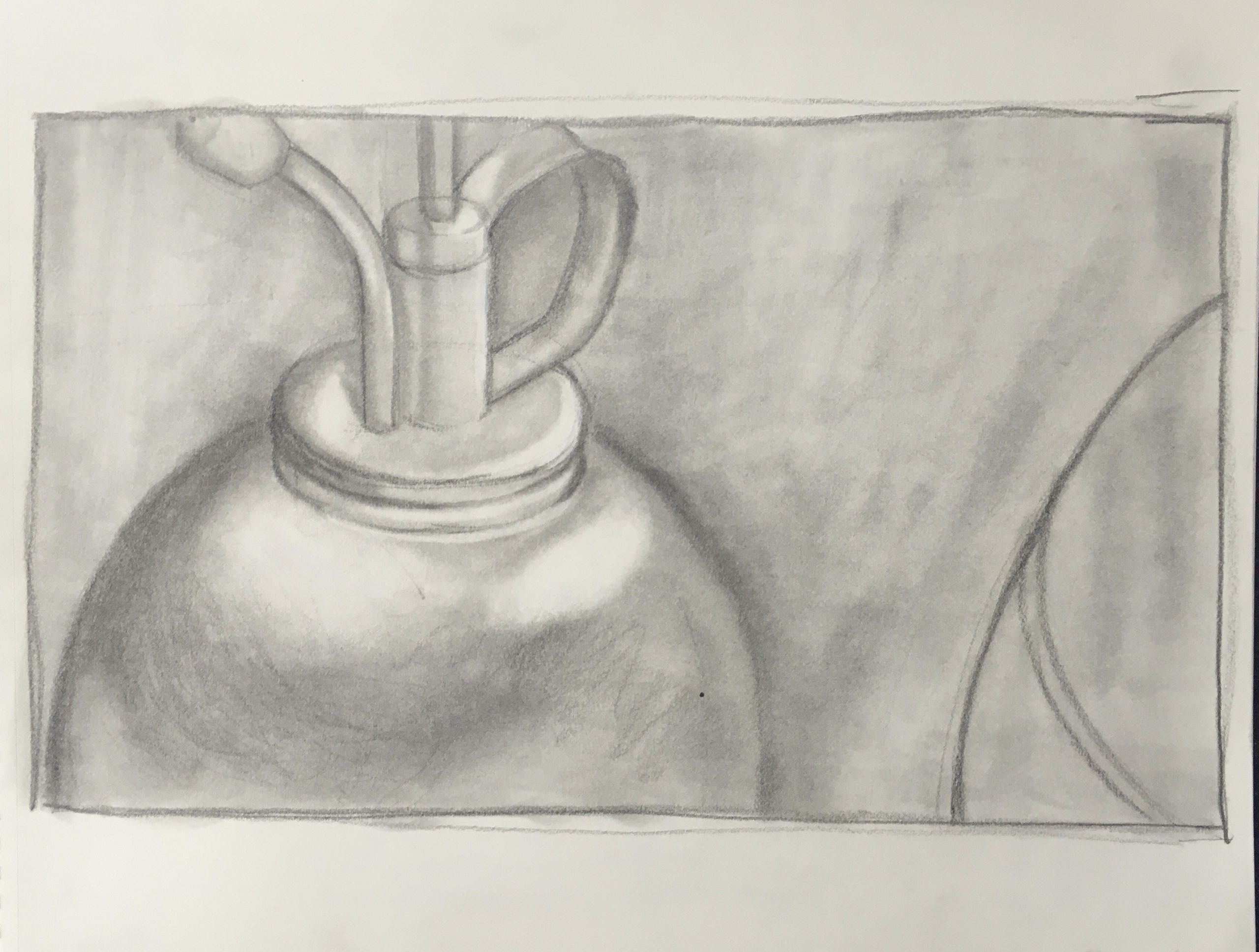 This assignment utilized a few different techniques, the two most prominent being value and composition. To prepare for this assignment we had done composition and value studies, and from those we chose one to make into a larger final piece. My main focus was trying to accurately render different values on a more reflective surface with more dramatic lighting.