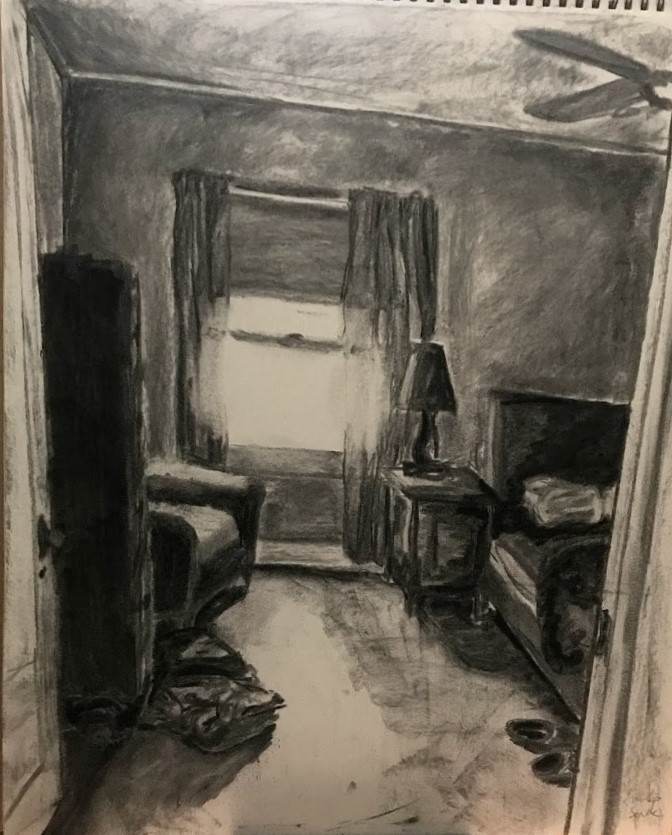 This drawing was a project in which the class was exploring value, perspective, and observation. Using soft vine charcoal, I focused on conveying distorted emptiness. This piece relates to depression and the hollowness of minds and people that are gone.