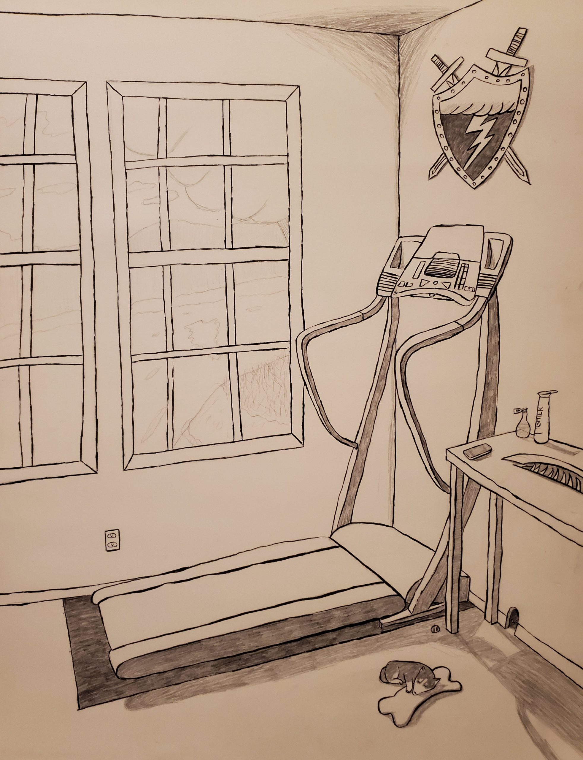 With this drawing I experimented with foreground and background objects. The concept of this piece was taking a real world room and object and adding in fantasy elements.