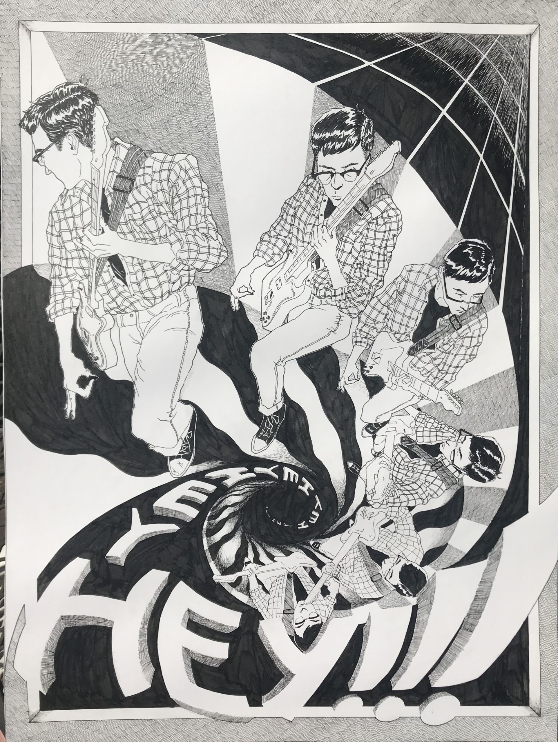 This drawing was made for a class project focused on line, movement, and depth. To create the illusion of space I created a frame around the main image, whilst also using a birds eye view and elements of perspective to create descending grids and spirals. To simulate motion, I drew one figure in several different stages of an action - strumming a guitar and kicking up- in order to create the illusion of a frozen animation.