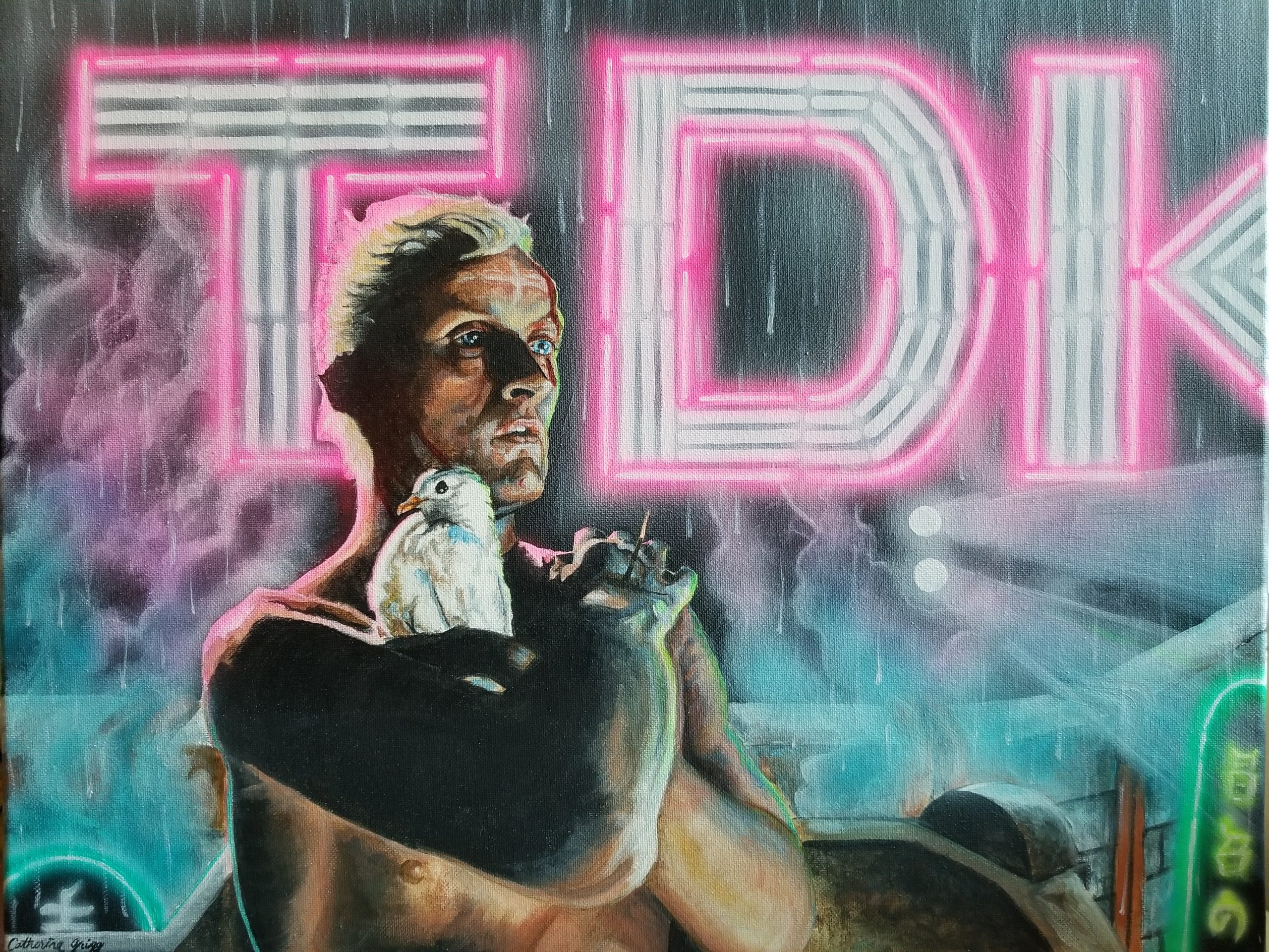 This was my final class painting which focused on fore, middle, and back ground. I chose to recreate a still from the film "Blade Runner." I emphasized the contrast of shadow and light with the TDK neon sign, to build depth between the main subject and his surroundings.