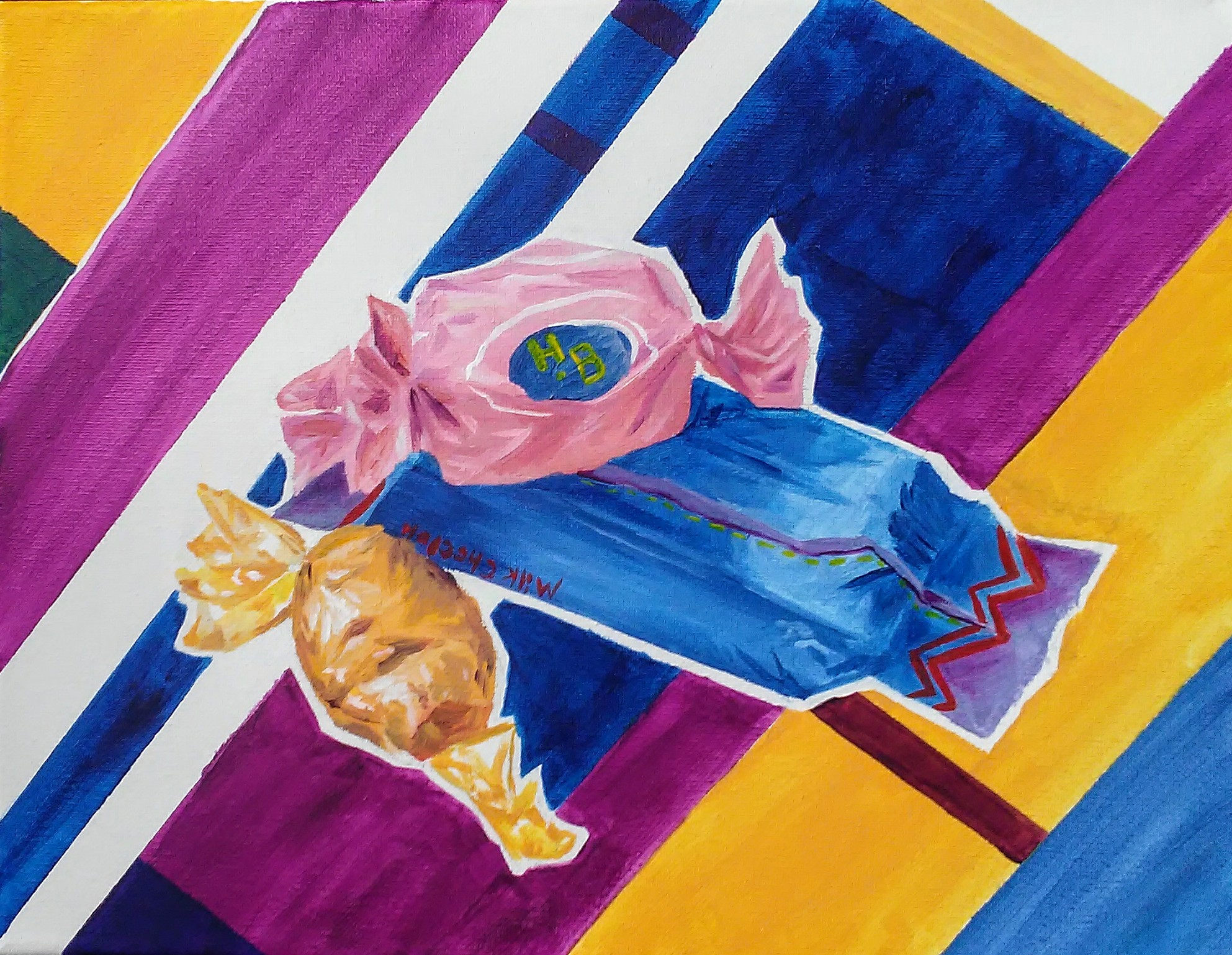 This painting is a still life of candy. I wanted to experiment with abstract backgrounds and different textures in candy wrappers.