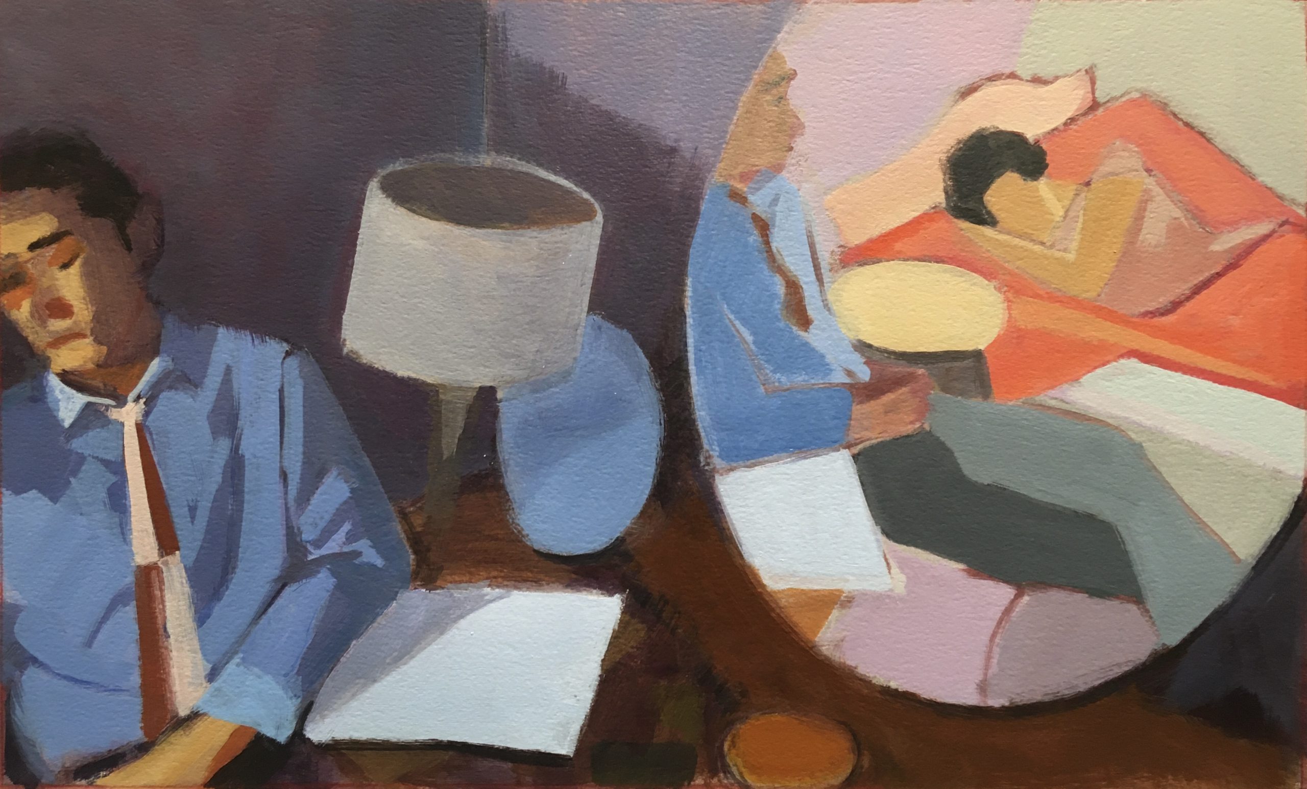 From an assignment called “What the Camera Cannot See”. This image is based on a still from the film “In the Mood for Love”. In my version, a color shift and simpler shapes help distinguish the world of the woman in the mirror from the man asleep against the wall. Is she in the man’s dream? Or is he in hers?