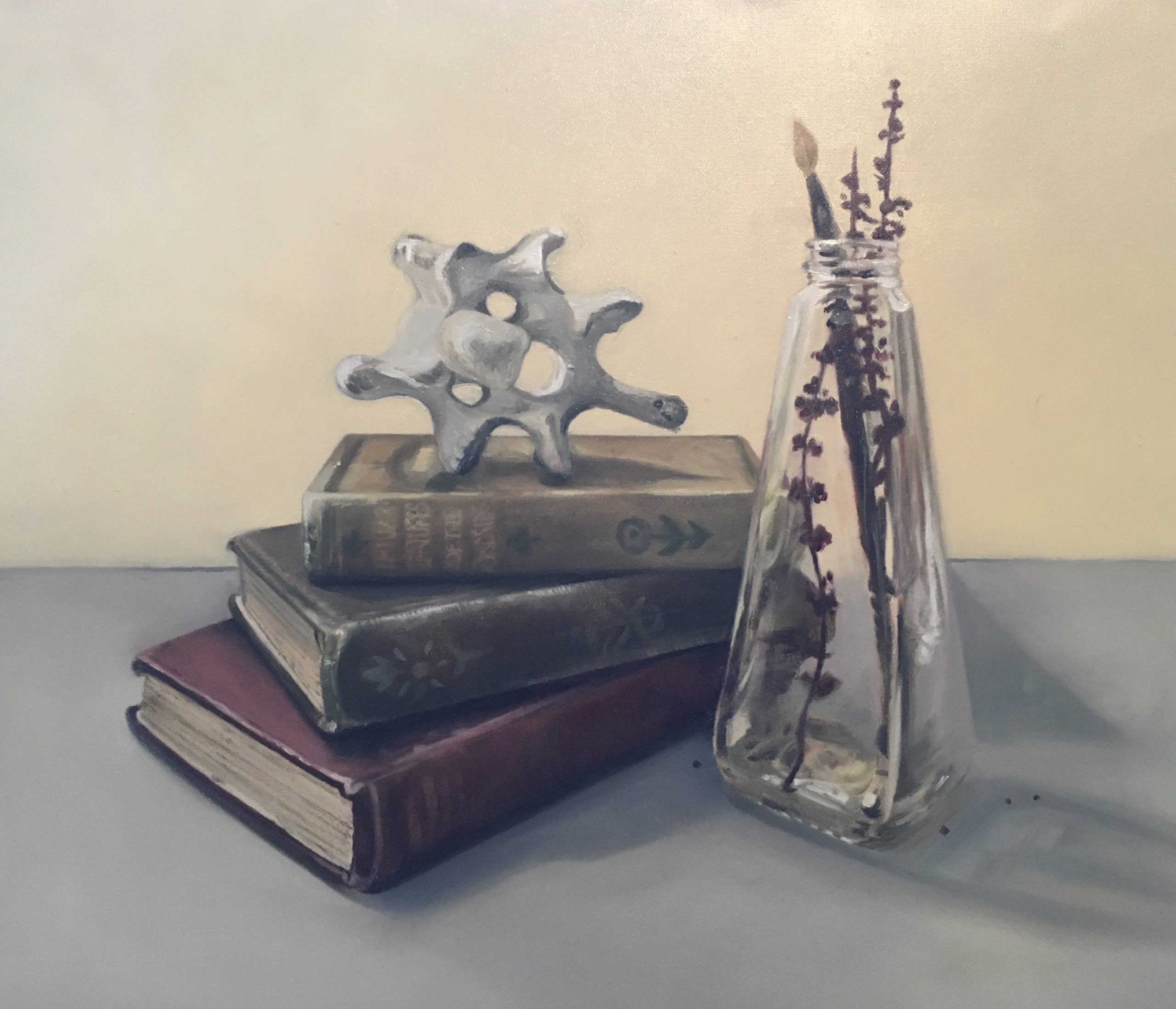 This still life painting was my first time painting with traditional oil paint. It was also my first time using the indirect method of painting. I gathered objects that are very dear to my heart; a paintbrush from my childhood, a vertebra found during the most magical chapter of my life and three 120 year old plant identification books that were passed down in my family. I wanted to learn oil painting for many years and took this remote art class as an opportunity to show up, have something positive to focus on and grow as an artist.