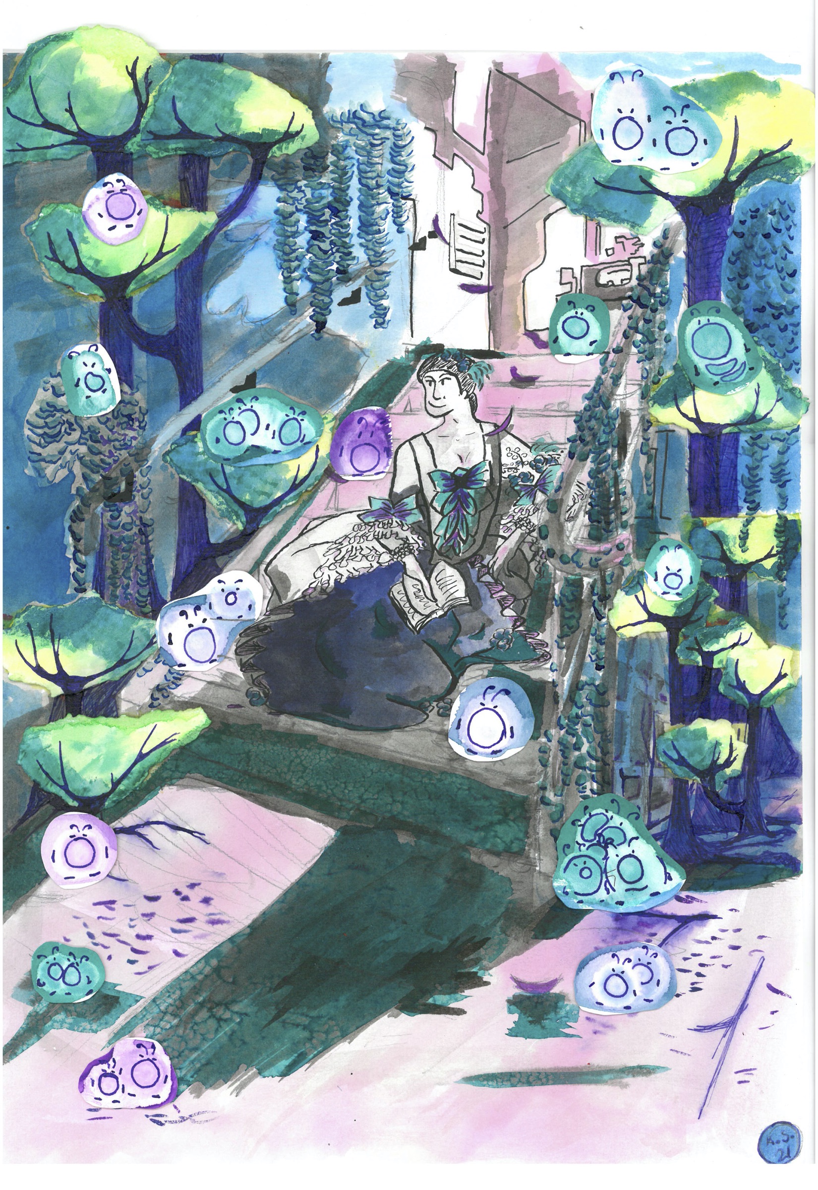 I accidentally dropped alcohol onto a separate watercolor that I'd been working on. The alcohol caused the still wet watercolor to bleed out in an interesting way which reminded me of avocados. Thus the Avocados rose.