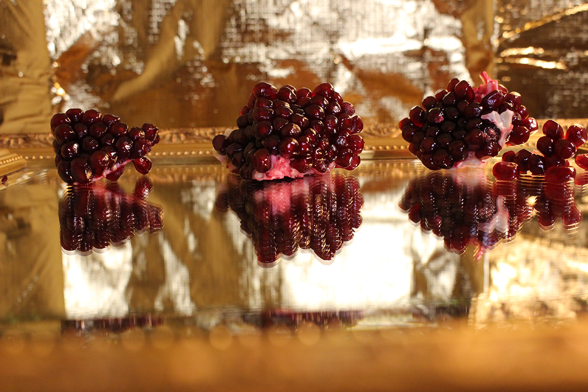 As a Persian-American, my goal was to capture the beauty of pomegranates before the end of winter. Pomegranates are a highly regarded cultural symbol for beauty, prosperity, fertility, immortality, and life. Most Westerners shy away from pomegranates because the process of cutting them can look very gruesome and bloody. Despite the process of peeling back the leathery skin, one discovers that the pomegranate seeds look like jewelry gems. Serving them onto a mirror was a meditation in itself of what beauty represents to me and finding what values I hold in regards to what makes something beautiful.