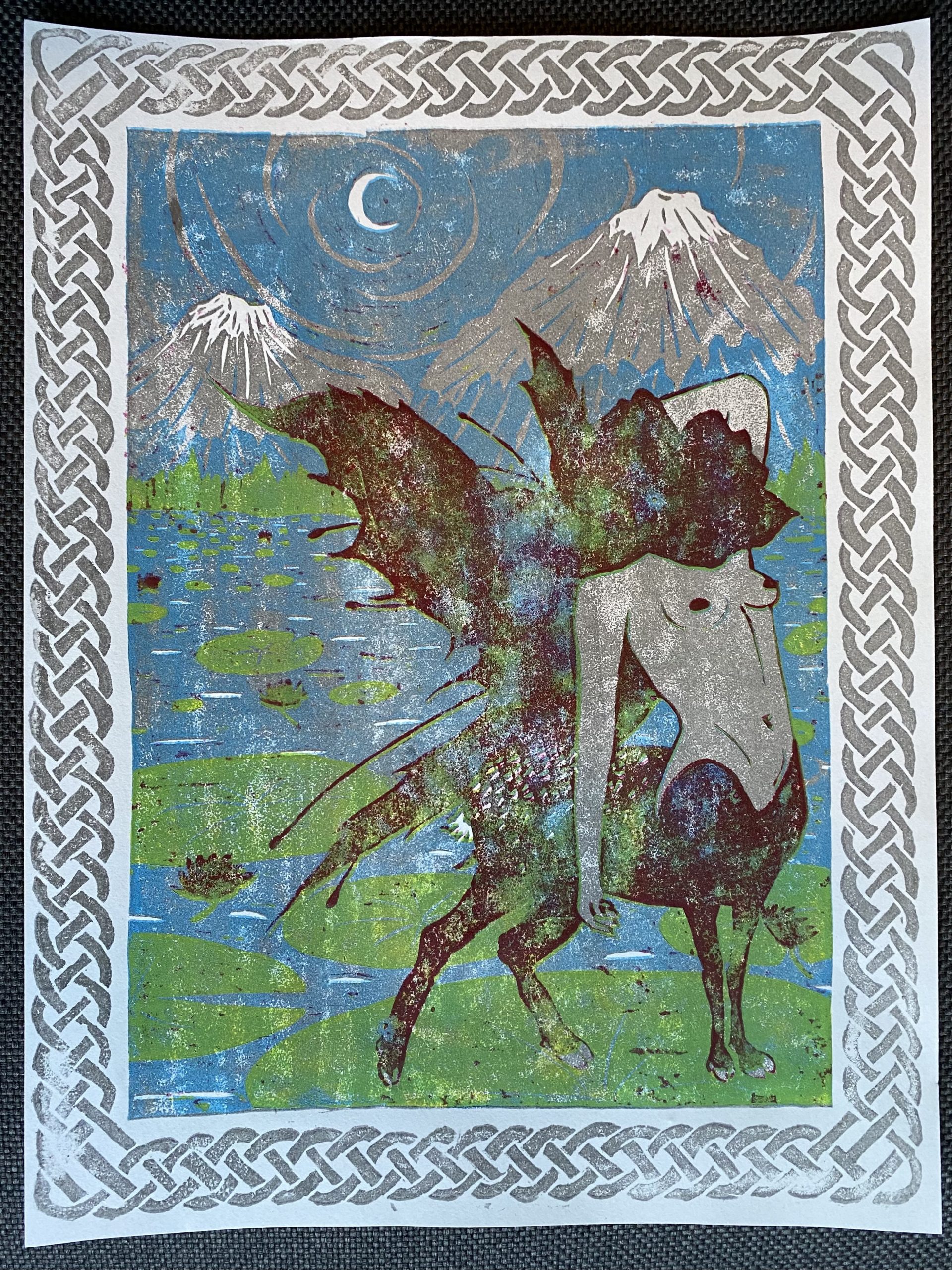 For this reduction plate I really wanted to play with combining things that would normally not go together. I stared with the idea of a center and morphed it by choosing to combine the top half of a woman with the body of a deer. Next I added a flower head, as this is a motif that shows up a lot in my artwork. I also added wings as I wanted to create a fae-like creature.