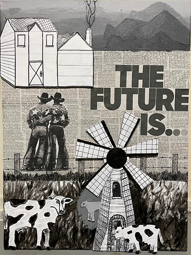 This piece was created in response to the prompt, "Another World is Possible". Students were encouraged to create a piece that showed our vision for another world. As a young queer man in the 21st century, I wanted to tap into my longing for a simpler domestic life that isn't plagued by the sociopolitical dilemmas and endless suffering of our world. I found myself dreaming of a world where my only worry is what me and my lover are going to do next, a world where we can live in touch with nature as humans were meant to instead of in opposition to it, a position capitalism often thrusts us into. I was largely influenced by Renaissance paintings depictions of Arcadia as a pastoral garden paradise.