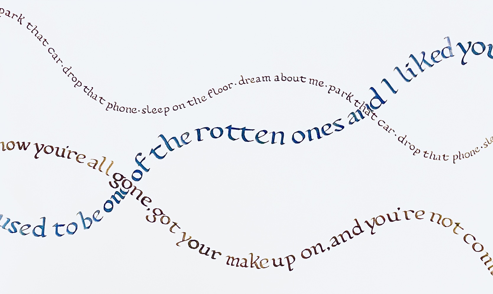 Learning any part of calligraphy is incredibly technical and requires a lot of practice, and writing on a curve was no exception. This calligraphy is Humanist Bookhand in 3 nib widths and two acrylic ink colors. I chose to work with the lyrics from a Broken Social Scene song, for which the piece is titled.