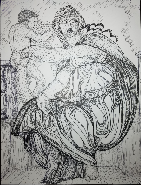 This drawing was completed as an exercise in line quality, size and texture. A classical painting was chosen as a requirement. Then we turned the image to black and white. We scaled up the drawing to an 18 by 24-inch Bristol art pad. Looking at the original, the exercise was to create textures and depth using our own style, and using different line thickness, and texture, to create depth and interest in the drawing.