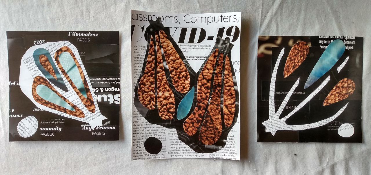 Using magazine paper, I took a line from William Blake's "Proverbs of Hell" ("A busy bee has no time for sorrow") to create a triptypch (three-panel) partially non-objective image. I used magazine articles focused on the impacts of COVID-19 on students to make up the backgrounds and larger shapes, then used the blue/orange colors and textures from the images of those articles to put together the remaining shapes. I was contemplating the mix of work/school culture with serious illness, and how I sometimes feel "too busy" to process the grief that comes with COVID.