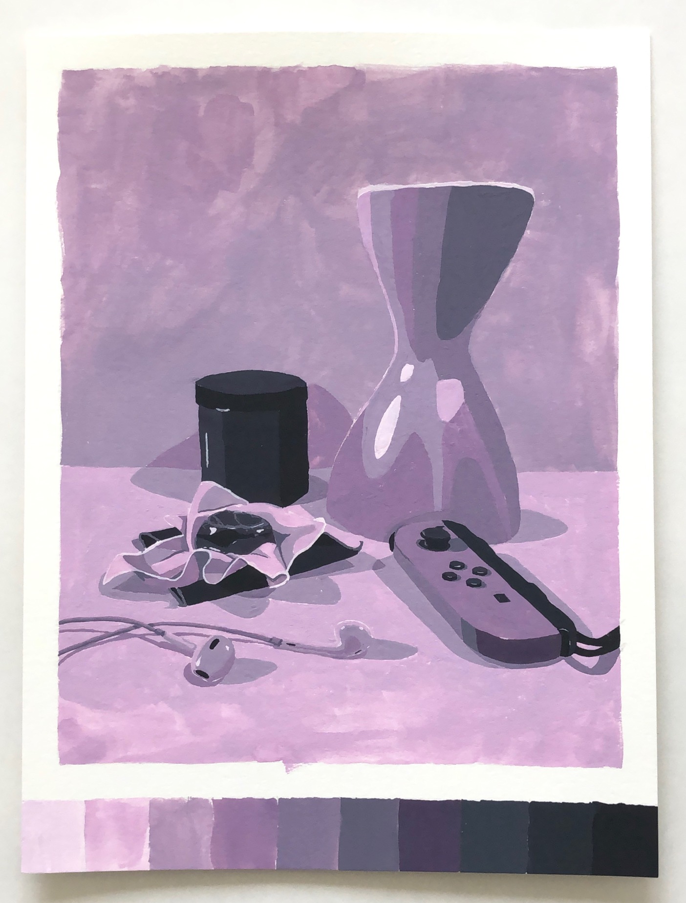 This is a monochromatic painting I made in my color design class. Monochromatic means it uses black, white, and grays, each mixed with a single color (violet for mine). I learned about the achromatic value scale and how those mix and interact with a hue. I learned how each of the values interact with each other, how they create shadows and form, and about using a range of values to create depth and avoid the lack of dimension. The theme of my project is my passions and hobbies. The vase represents interior design, the paint jar represents all of the art I love to do, the rosin is my violin playing, the earbuds my music listening, and the Joy-Con my gaming.