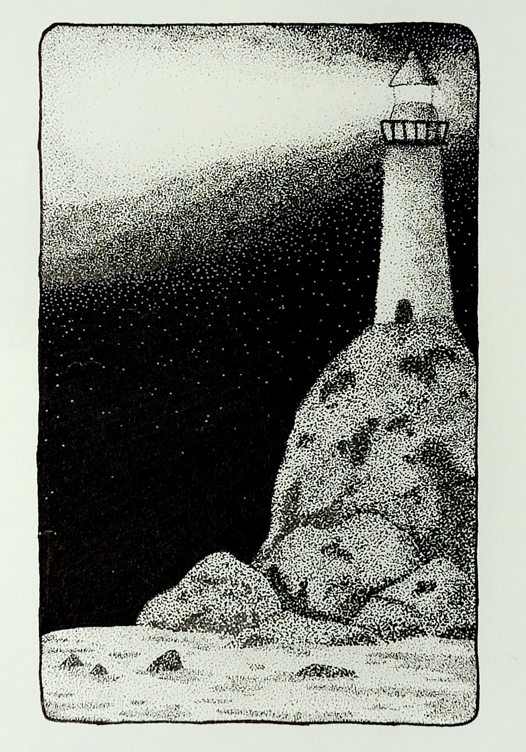 This drawing was the product of one of our Drawing 1 assignments regarding different ways to show value. I chose to work with a stippling/pointillism style for this piece and only used black and white to enhance the array of values. I focused primarily on making the light projected from the lighthouse very luminous as it cuts through the pitch black night sky.