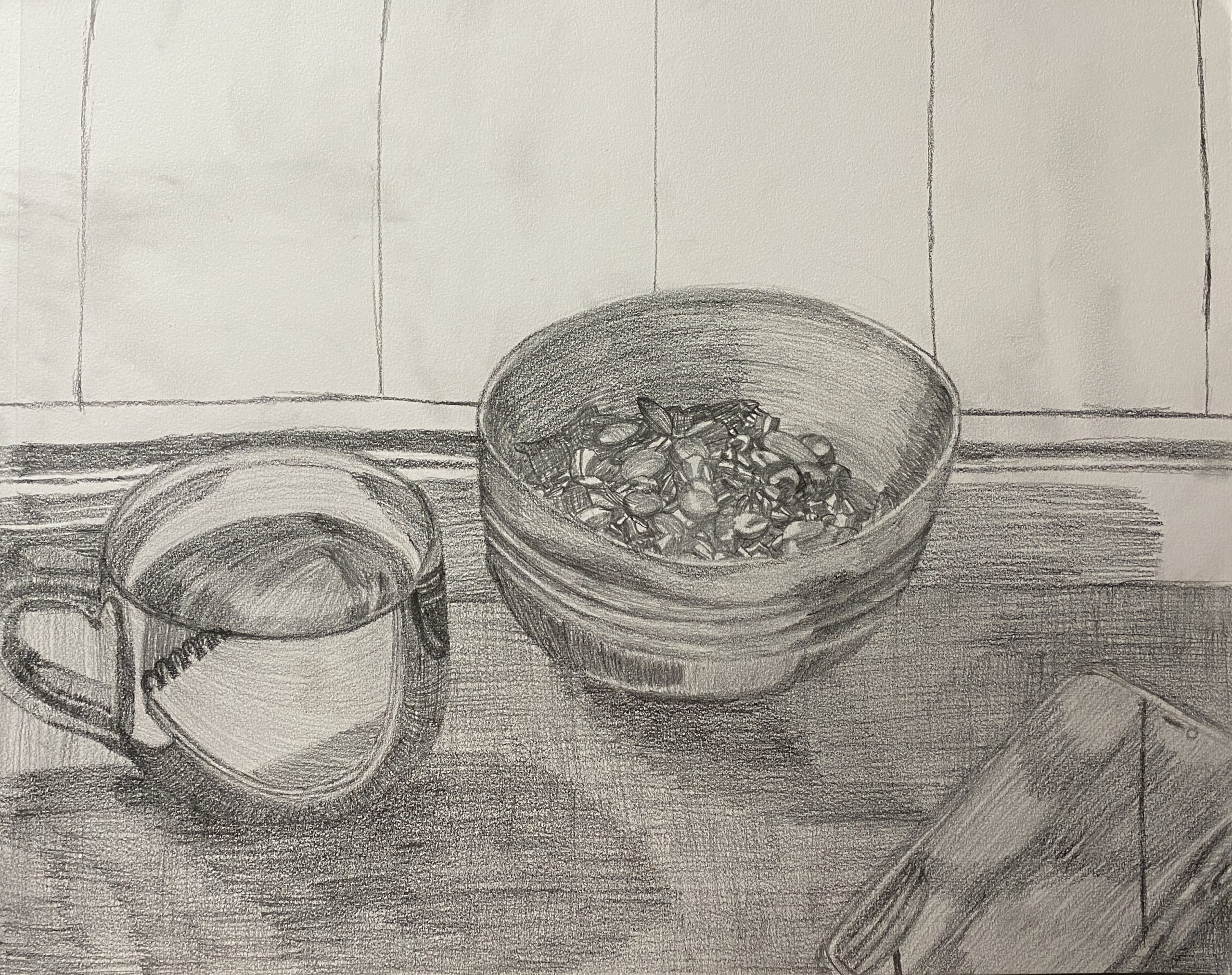 Hatching and cross hatching from life. The piece was drawn well in front of the sketchbook, that is why it is in the reflection of the mug. Every piece of trail mix was copied, as well as the coffee.