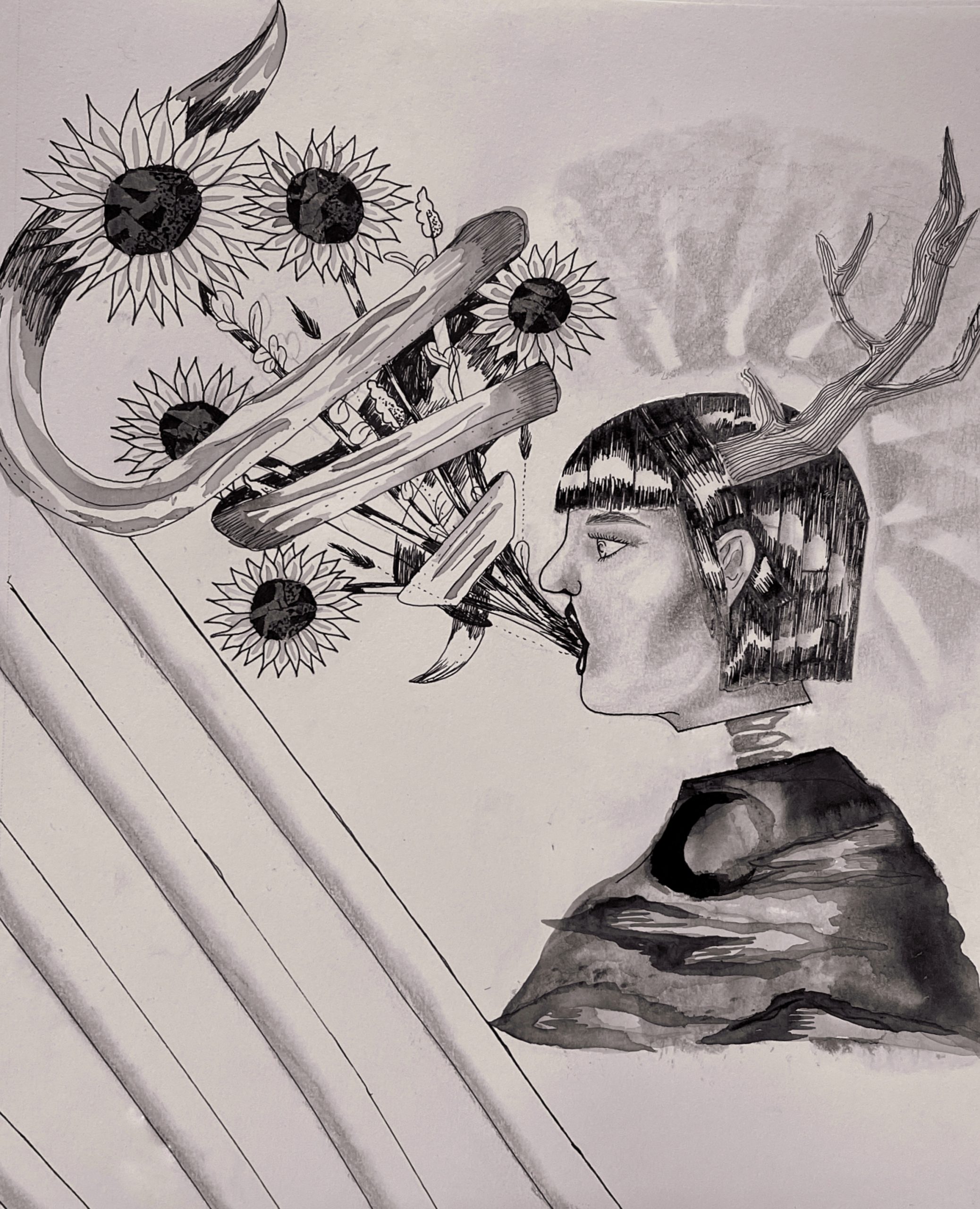 This drawing was a product of our class “tape drawings” assignment. Using tape, we block out spaces and/or use tape in our final pieces. In this project, I explored the use of tape as a blocking/spacing agent. The ink wash was experimental as to not give her body a solid form. As for the graphite, it was important to use to render human visual qualities.