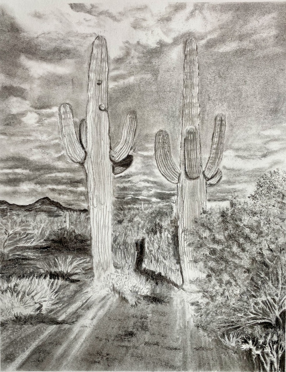 This drawing was part of a three drawing series of desert scenes. In this drawing I focused on light and texture and also creating depth and mood. I wanted the cacti to have a glow about them the way they did when they caught my eye on the desert trail.