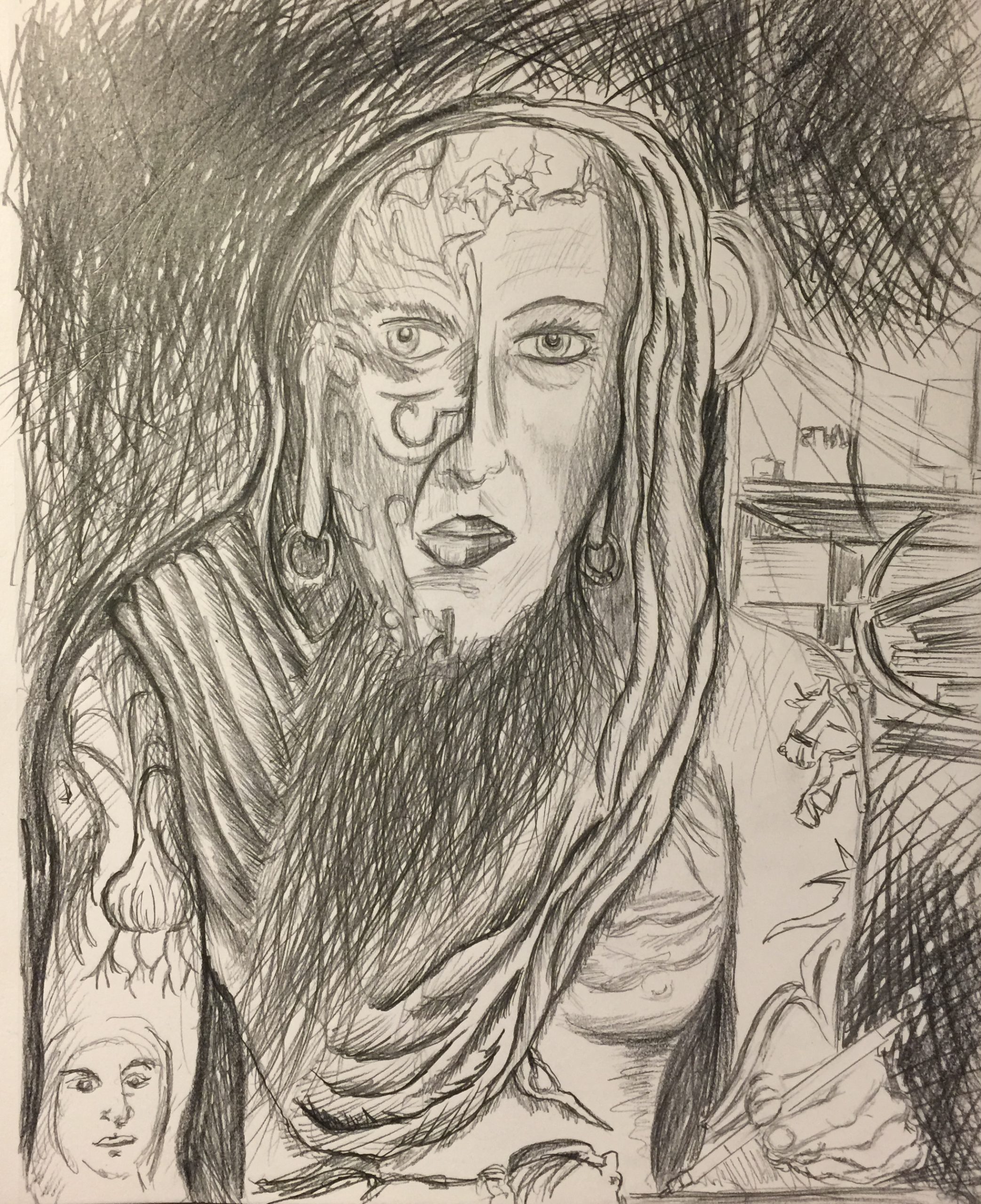 In this work I explored the energetic possibilities of graphite through hatching and cross hatching. I applied make-up in a feminine way while keeping the other half of my face in what I consider masculine form. this drawing took about 7 hours staring into a metal serving tray with barely a reflective advantage. This self portrait was very uncomfortable for me in the process of rendering how I saw myself as well as felt. I didn't want to submit it for class but I did. I'm almost 50 and have been queer since a child. This work represents that life of awkwardness growing up in northern Minnesota, I believe.