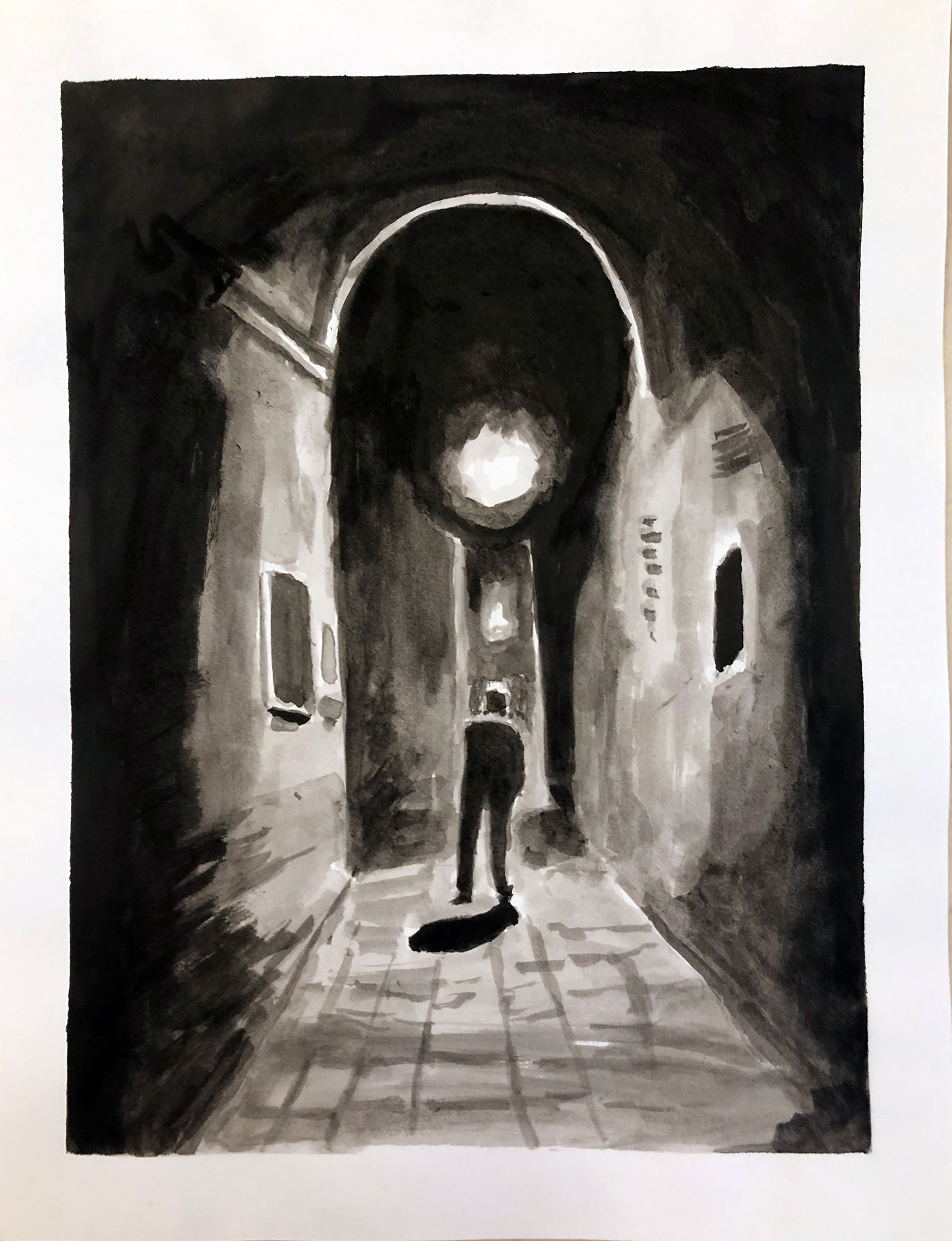 Alberto Santaballa, "Light into Darkness," Fall 2021, India ink with brush, 14 x 11"
