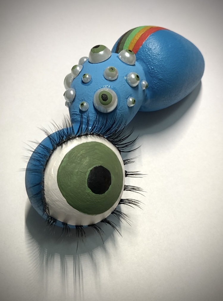 For this piece, I created an assemblage sculpture of an original character named Apollonia. I was inspired by assemblage artist Betye Saar, whose pieces are made from recycled and found materials. For Apollonia’s body, I used a bouncy ball and two makeup sponges. Acrylic paint gives the body color, and the large eyeball serves as the focal point. The smaller eyes are craft pearls, and false eyelashes complete the surreal image. The inspiration for this piece comes from the fear of being watched, especially today when so much of daily life is recorded on camera and shared on the internet. Video Link: https://youtu.be/9eqVkbPQRAs