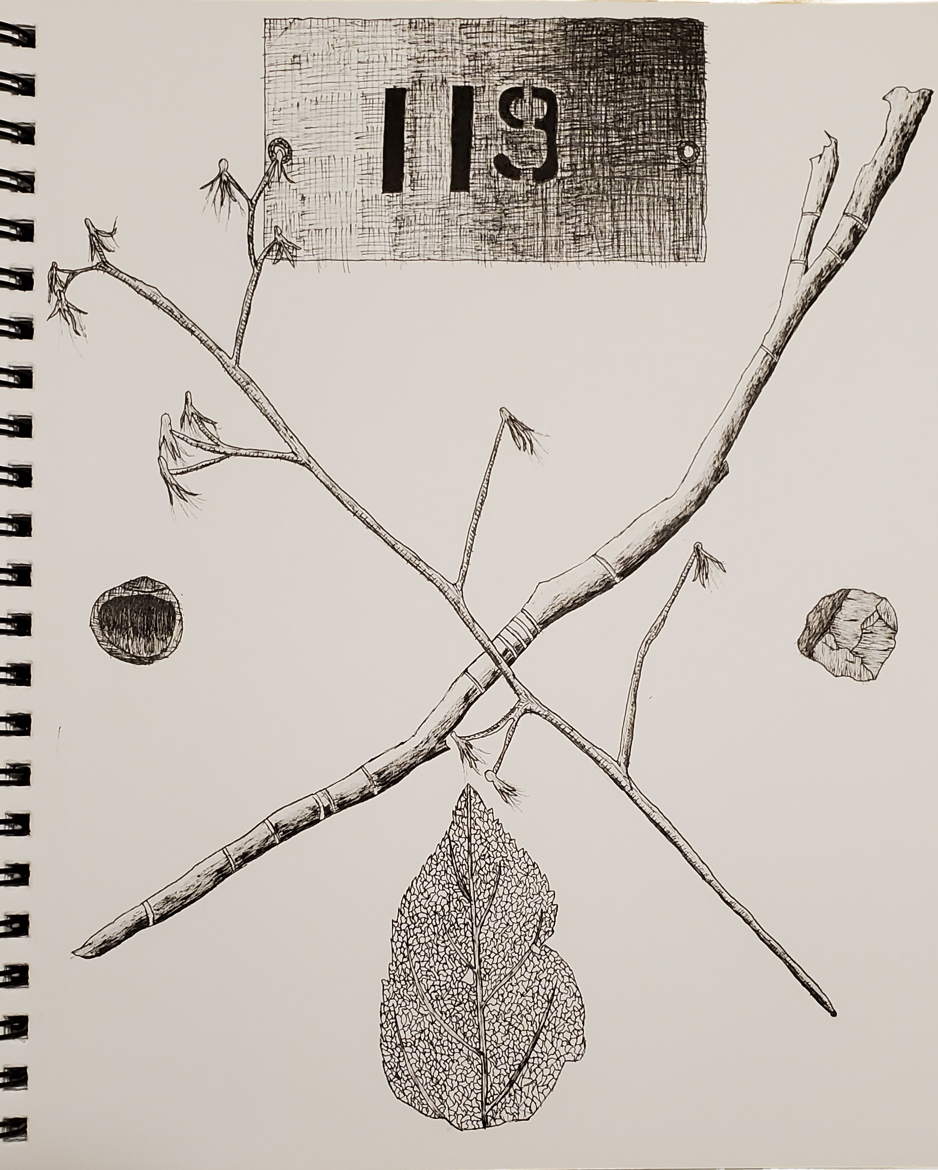 In this drawing, I used a micron pen to trace around the materials that I gathered outside and try to put some texture and perspective into them. I wanted my drawing to have a pacific northwest kind of feel, but also give it some mystery as well.
