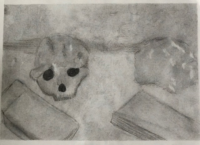 This drawing was a practice sketch that we did in class to practice values, depth and volume. I used vine charcoal and pencil to do a light sketch to outline where I would place objects. I then used compressed charcoal and a charcoal pencil to fill in darker values and create shadows. I also took an eraser to deduct some of the grey tones to make highlights. I wanted to focus on getting the shape of things right.