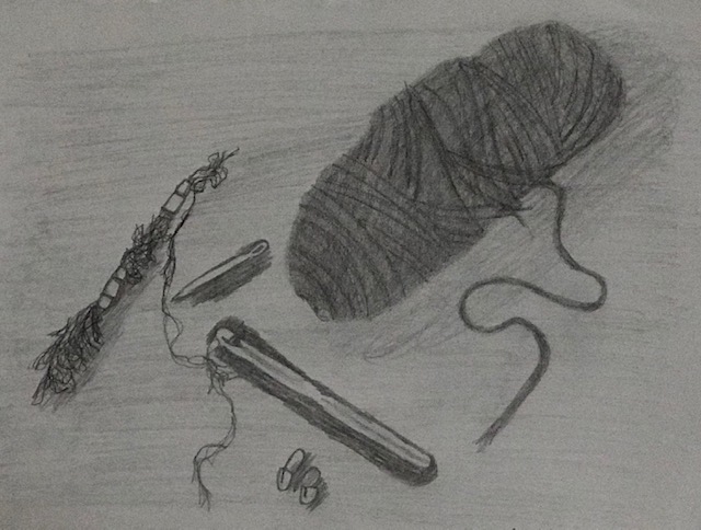 This drawing was to practice still life's more, and to practice a range of values. I tried out different values and tones of greys as well as trying out different techniques. I did blind contour to make scraggly textures, and did mass and line to make up the big yarn ball.
