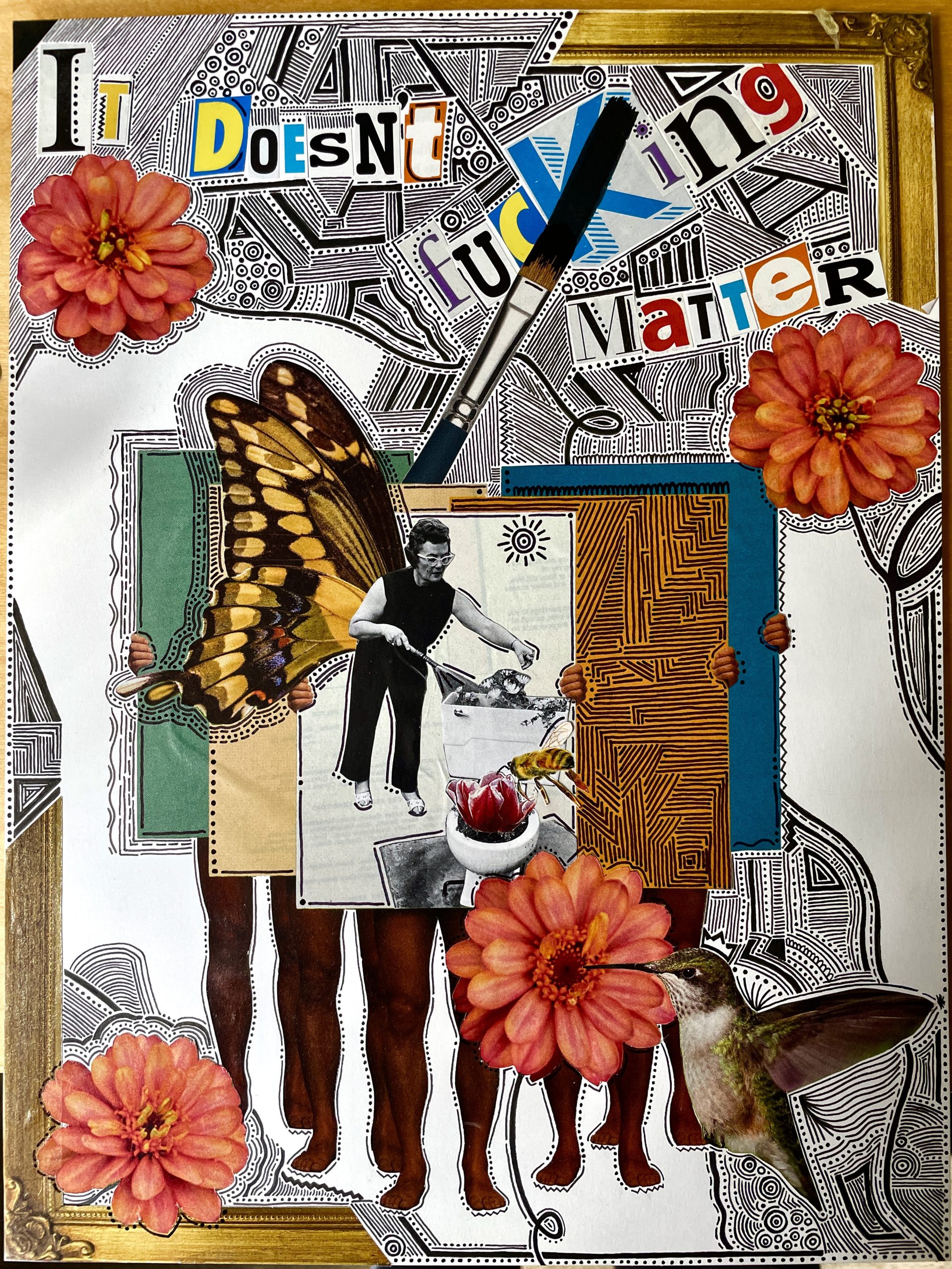 This project was done for my drawing class as our intro to collage. My final piece ended up with magazine cut outs of people, flowers, frames, letters, and critters. I was originally thinking way too hard about this project when my partner reminded me that it wasn't my "end of the world" project, which brought me to putting the sentence on the collage saying "It Doesn't Fu**ing Matter".