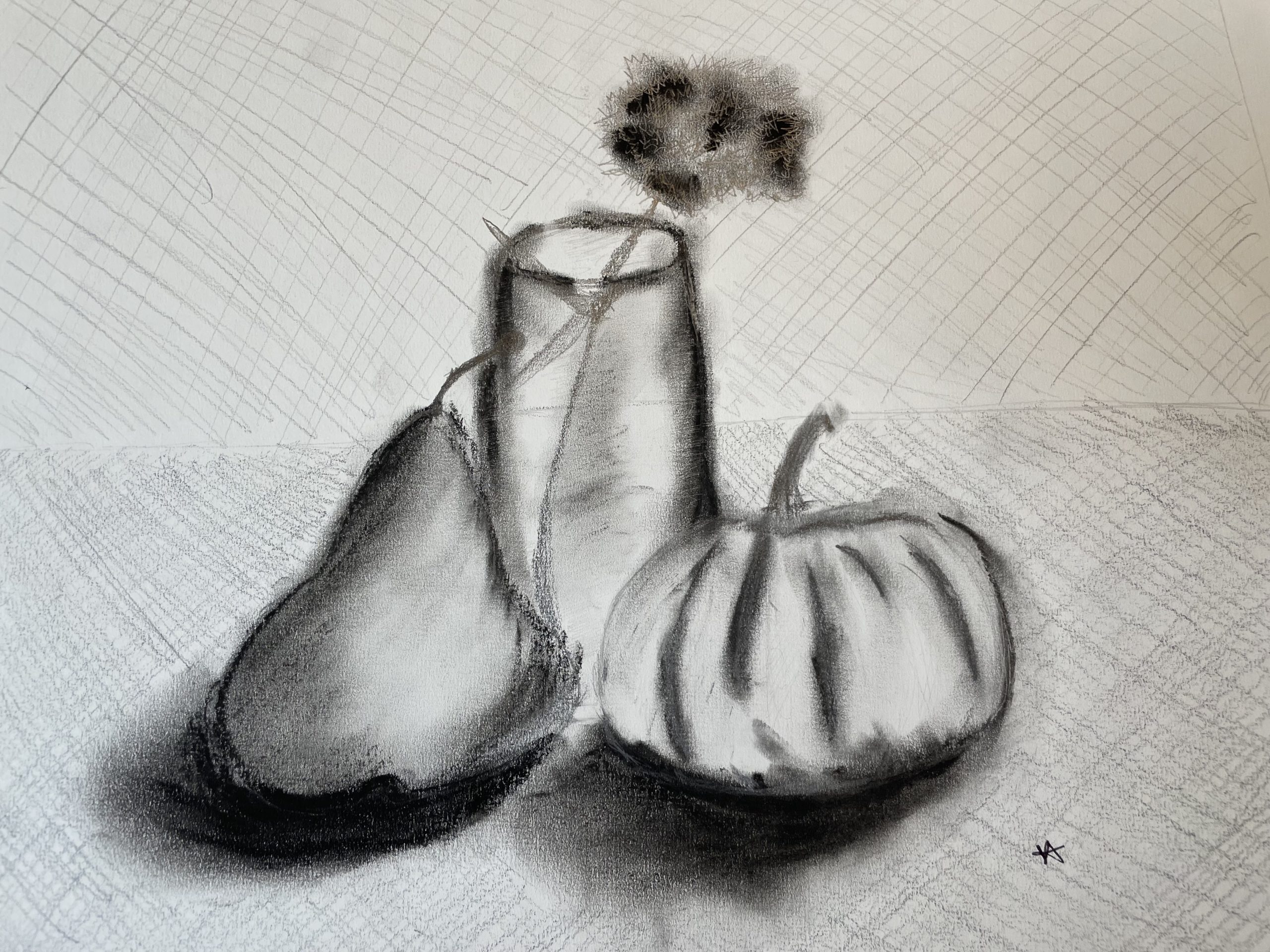 This drawing was a class projects where I was doing a still life perspective and it felt festive to include a little pumpkin that I had since it was during the fall. I focused on creating depth with each object by using charcoal.