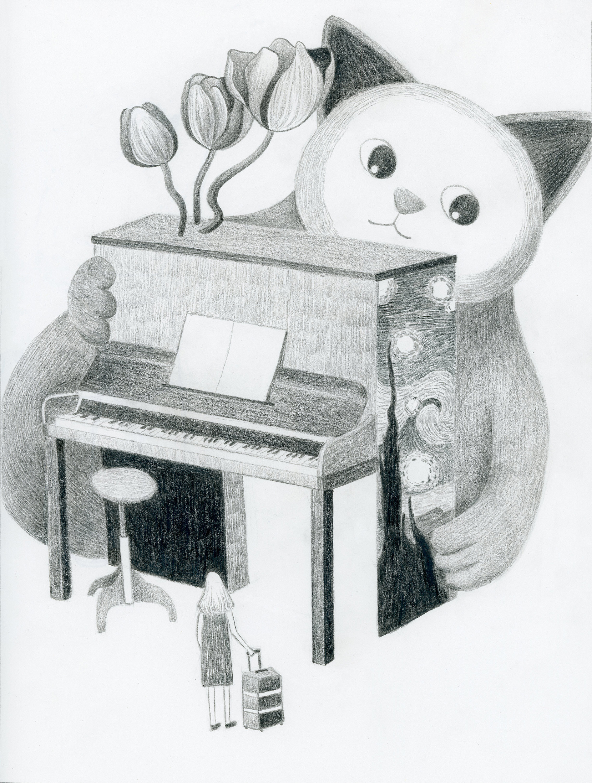 This drawing is inspired by a class project entitled ‘Self portrait in 5 objects’. I explored different textures of pencil and charcoal, aiming to express a whimsical space filled by things I like and that characterize me: cat, flowers, music, painting, and travelling.