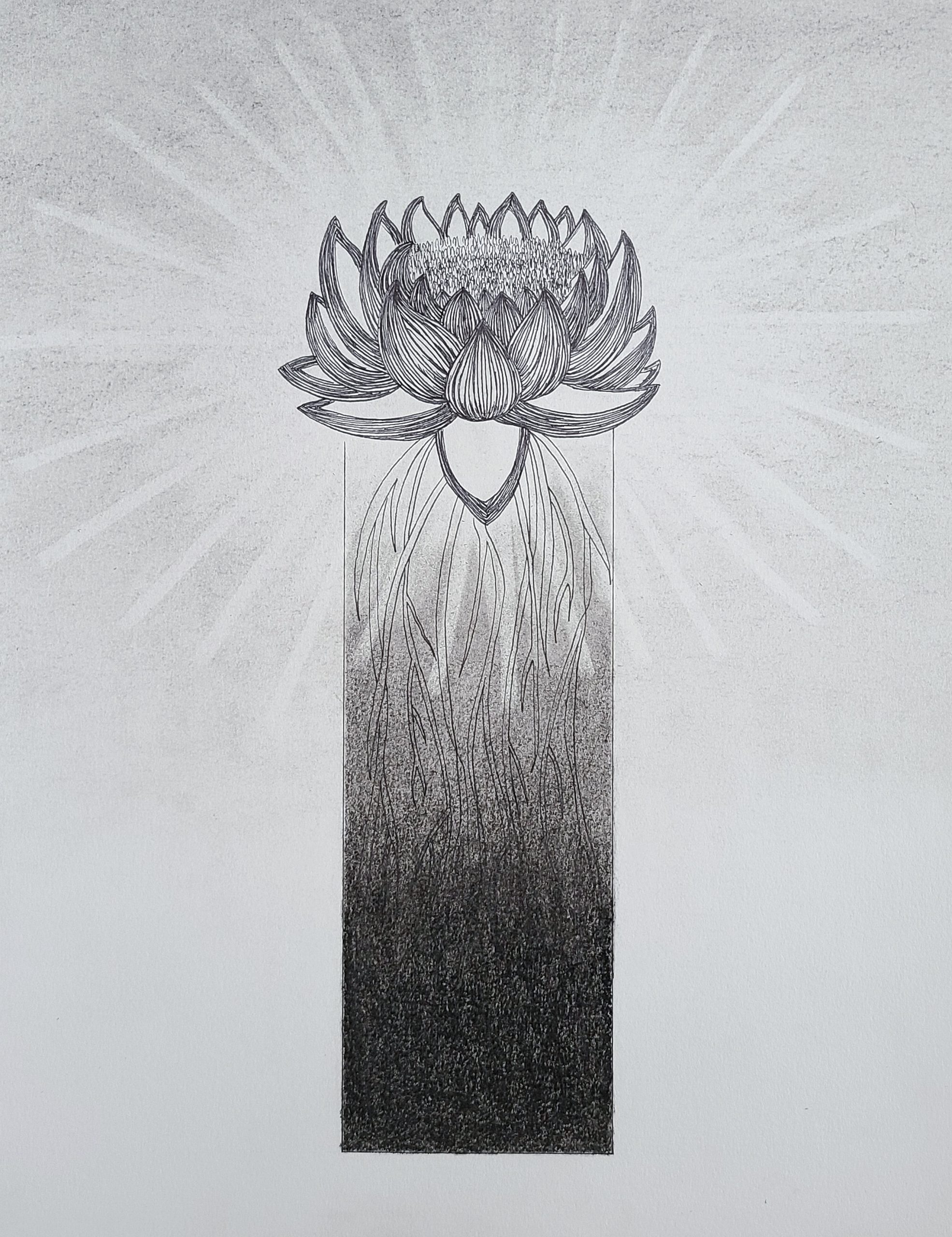 This drawing is based on crossing personal borders, specifically being our most authentic selves. The lotus grows from the darkest waters towards the light and blooms this beautiful flower. In many cultures this represents transformation and resilience. The murky water in this drawing represents the noise that is societal expectations, shame, and judgements, and our own personal expectations, shame, and judgements that we put on ourselves. When we are our most vulnerable and authentic selves despite all the noise, we break free of those limitations. We bloom. The noise no longer affects how we show up in the world.